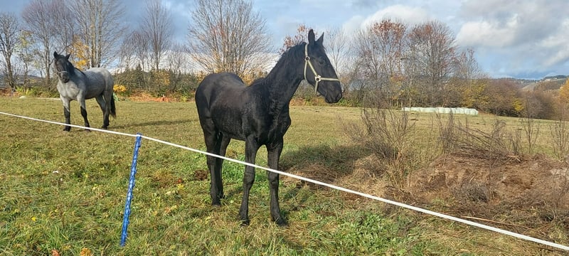 Very sweet young Baroque Pinto stallion. He is expected to grow quite tall, has a beautiful, expressive movement, and is very affectionate. An ideal partner for leisure riding or dressage. When offered for sale, he is accustomed to trailer loading, knows basic foal handling, is vaccinated, regularly dewormed, and is well-behaved when haltered and led. He lives in a mixed herd, is well socialized, and is familiar with dogs, cats, agricultural machinery, and electric fences. Naturally, he has a passport. His dam mare is on the farm. We look forward to welcoming you to meet this lovely colt. Inquiries mentioning "final price" or similar will not be answered.