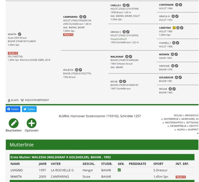 Verkaufe meine Stute aus dem Jahrgang 2009, sie ist ca 173 groß und bis S** platziert. Sie stammt von Camparino ab (Abstammung unter den Bildern) und hat einen gekörten Bruder der bis zur Klasse S in der Dressur platziert ist. Ihre letzte Platzierung war Anfang 2023, dann haben wir sie gekauft und als Zuchtstute genutzt. Sie wird also aktuell nicht geritten und ist auch nicht tragend. Ich könnte sie mir wieder als Reitpferd oder als Zuchtstute vorstellen Die Stute benötigt zum Reiten Eisen, warum ist nicht abgeklärt. Sie wird aufgrund von Verkleidung verkauft, sie auch unsere anderen Stuten