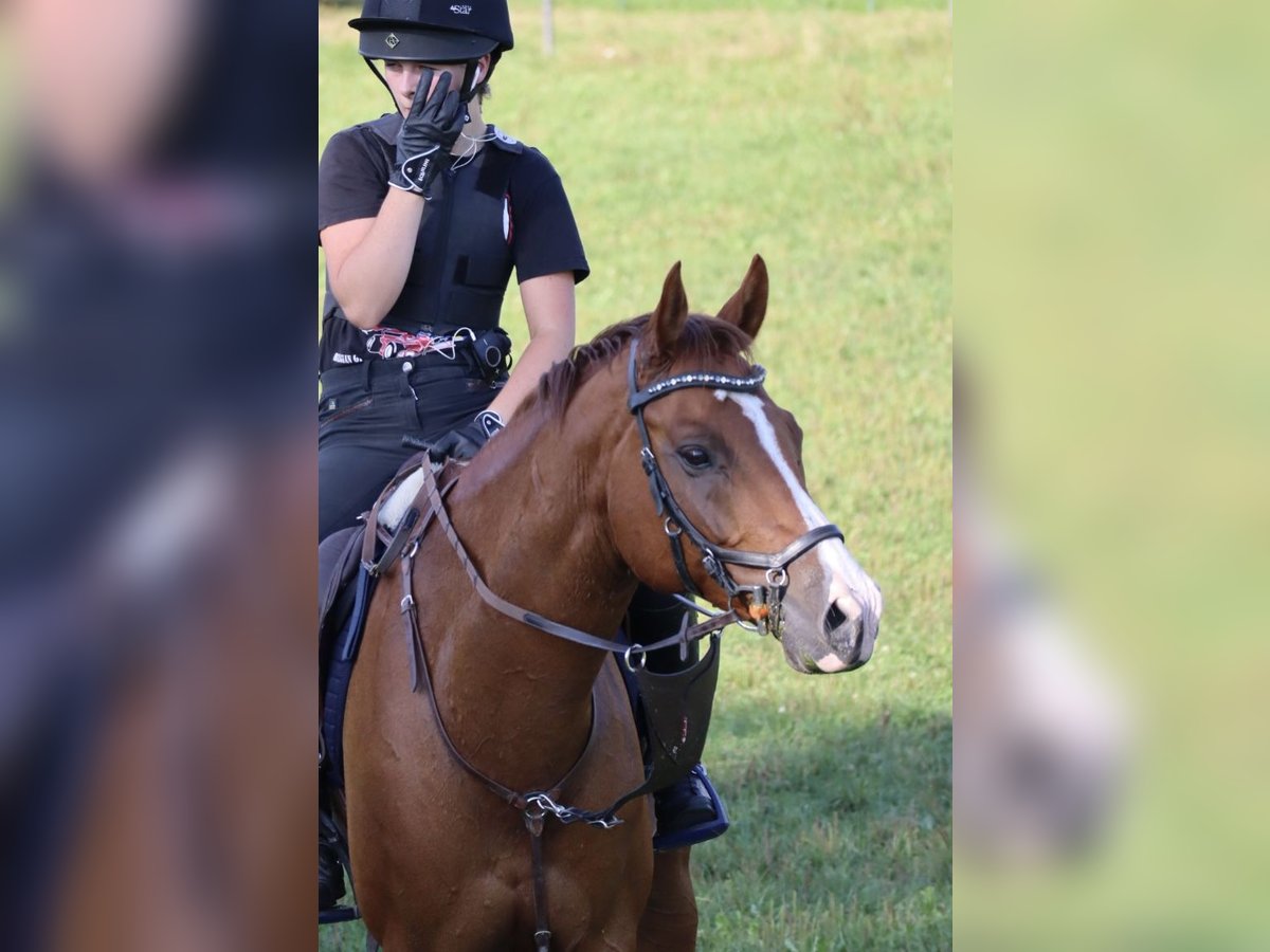 Sunny ist ein hübscher, aufgeweckter Wallach, der Dressurtechnisch auf L/M Niveau (Traversalen, Galopp-Seitengänge funktionieren gut, leichte Pirouettenansätze sind zu erkennen) und im Springen bis L ausgebildet ist. Er arbeitet gern und braucht einen einfühlsamen und konsequenten Reiter und Freund, der Lust hat, sich mit ihm zu beschäftigen und Zeit zu investieren. Diese Zeit habe ich momentan leider nicht, da ich mich im Abistress befinde und voraussichtlich danach studieren werde, das heißt ich werde ihm nicht gerecht werden. Mit anderen Pferden ist er äußerst umgänglich und nicht dominant, kann also sowohl mit Stuten, als auch mit Wallachen gemischt auf der Koppel stehen und genießt die sozialen Kontakte. Er wurde immer abwechslungsreich bewegt (Platz, Halle, Gelände). Er musste bis vor einem Monat pausieren aufgrund einer Verletzung vor 6 Monaten, wobei die vollständige Verheilung der Sehne Ende Januar von der Tierärztin bestätigt wurde. Im Moment befindet er sich im Aufbau und geht ca eine Stunde pro Tag Schritt und wird in steigernden Zeiten gearbeitet. Während der ganzen Zeit wurde eine gewissenhafte Therapie durchgeführt. Sunnys Trainig sollte trotzdem noch ca einen Monat wieder bis zu normalem Arbeitsniveau aufgebaut werden. Mit steigendem Niveau steigt auch der Preis…! Er ist natürlich brav beim Hufschmied, Verladen ist auch kein Problem und er war schon oft auf Turnieren oder Lehrgängen unterwegs. Dass Impfungen und Wurmkuren regelmäßig durchgeführt wurden, ist klar. Er kann leider zur Zeit noch nicht Probegesprungen werden.