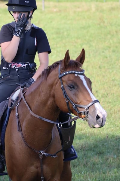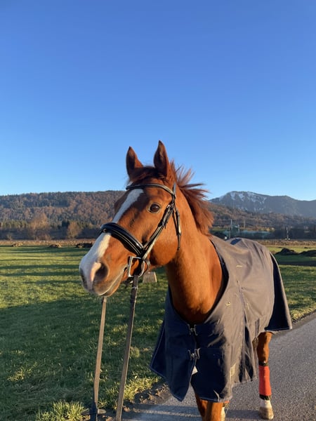 Sunny is a handsome, lively gelding, trained in dressage up to level L/M (shoulder-in, leg-yield, and extended trot work are well-established, and early pirouette attempts are visible) and jumping up to level L. He enjoys working and needs an empathetic and consistent rider and friend who is willing to spend time with him and invest in his training. Unfortunately, I currently lack the time for this, as I am under exam stress and plan to study afterward, which means I wouldn’t be able to give him the attention he deserves. He is very social and non-dominant around other horses, able to share a paddock comfortably with mares or geldings and enjoys social contact. He has been regularly exercised in different environments (arena, indoor hall, and outdoor terrain). Until a month ago, he had to pause his training due to an injury sustained six months ago, but the veterinarian confirmed full healing of the tendon at the end of January. Currently, he is in a rebuilding phase, walking 1 to 1.5 hours daily and gradually increasing work intensity. Throughout this period, a thorough therapy was carried out. Sunny’s training should still be built up over approximately another month to reach normal work levels. The higher his training level, the higher the price…! He is naturally well-behaved when farrier work is done, loading is no problem, and he has competed in numerous competitions and attended clinics. Vaccinations and deworming have been kept up to date. Unfortunately, he is currently not available for trial jumping.