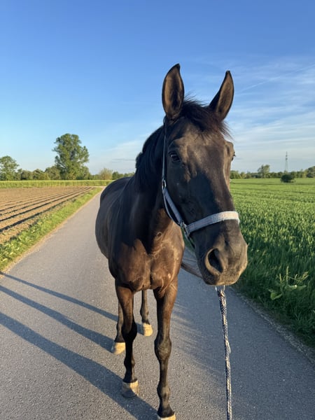 Dino is a 14-year-old Bavarian Warmblood gelding. Due to lack of time, which prevents me from giving him the attention he deserves, I am looking to place Dino in good hands. He has an approximate height of 17.3 hh and is suitable for tall riders, but he can also be ridden comfortably by less experienced or smaller riders. Initially, he may need some time to get used to new people, but he shows no bad habits, aside from some gentle testing. Once settled, he is a reliable partner and a loyal companion. He has been ridden mainly for leisure, with a focus on dressage work, but small jumps and hacking out with other horses are no problem. Dino does not display any vices such as bucking, rearing, or kicking. Currently, he is kept in a box stall with daily turnout and a paddock walk, sharing a paddock with a mare. If you have any further questions, please feel free to contact me. Not a desperate sale, only to suitable, experienced riders!