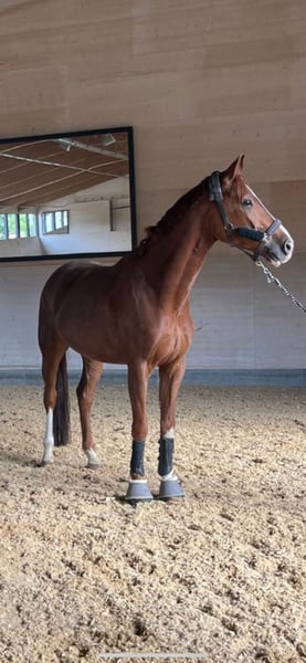 Toblerone – liebevoll „Schokolade“ genannt – ist ein ausdrucksstarkes, bayrisches Warmblut mit besten Anlagen für den Dressursport. Sein Potenzial wurde früh erkannt: Als Fohlen wurde er auf der Fohlenschau in München-Riem Siegerfohlen. Kein Wunder – Sein Großvater ist kein Geringerer als Totilas, einer der berühmtesten Dressurpferde der Welt. Toblerone ist aktuell auf dem Niveau Dressurpferde L . Kleinere Sprünge macht er brav – auch wenn sein Haupttalent klar in der Dressur liegt. Direkt vom Züchter ist er seit dem 3. Lebensjahr in meinem Besitz. Er wurde mit viel Geduld, Zeit und Gefühl ausgebildet Unter dem Sattel ist er motiviert, fein zu reiten und immer bemüht, alles richtig zu machen. Er denkt mit, ist leistungsbereit und möchte seinem Reiter gefallen. Im Alltag zeigt er sein wunderbares Wesen: sozial mit anderen Pferden, verschmust, menschenbezogen und absolut umgänglich. Ein Pferd, das Nähe sucht und die Bindung zu „seinem“ Menschen genießt. Trotz seiner lieben Art bringt er Sensibilität und Qualität mit, die gefördert werden möchten. Daher wünsche ich mir für ihn einen erfahrenen, sicheren Reiter mit feiner Hand, der sein Potenzial erkennt und weiterentwickelt. Er ist kein Anfängerpferd – sondern ein Partner für jemanden mit Ambitionen und Gefühl. Ich wünsche mir für ihn ein Zuhause, in dem er weiter wachsen darf – sportlich wie auch als treuer Begleiter. Platz vor Preis