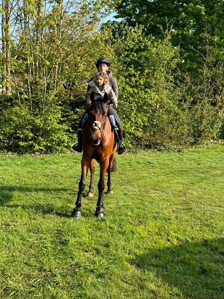 Schöner 8-jähriger Rüde. Sehr gut geritten und anhängliches Pferd. Ehrliches Temperament und leicht zu reiten. Während des Dressurtrainings manchmal etwas schüchtern, im Parcours eher vorwärts gerichtet. Er gibt immer sein Bestes, um eine fehlerfreie Runde zu zeigen. Brav bei Ausritten, sowohl alleine als auch in der Gruppe. Nicht für Anfänger geeignet, aber ideal als Übergangspferd vom Pony zum Pferd, vorausgesetzt, der Reiter ist es gewohnt, ein vorwärts orientiertes Pony zu reiten. Ein kooperatives Pferd, um gemeinsam schön zu wachsen. Er hat Turniererfahrung bis 1,20 m, bei denen er mehrfach fehlerfrei blieb und platziert wurde. Er geht problemlos in den Hänger, ist brav beim Hufschmied und beim Tierarzt (jährlich). Stockmaß 1,67 m. RX im September 2021 abgenommen und genehmigt.