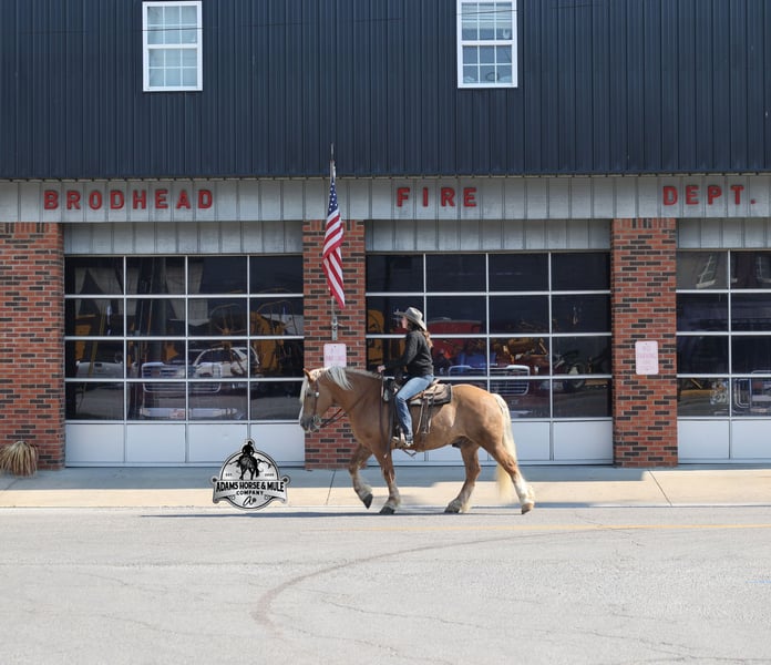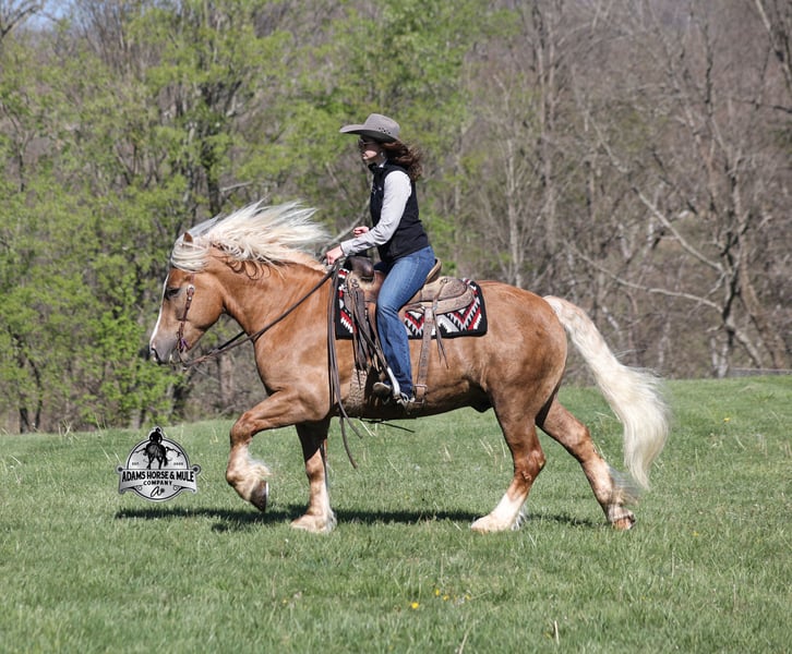 Go to visit our website for more pics and video link at www.AdamsHorseAndMuleCo.com AHAMC has been in the horse business and sold horses over the internet since 2005. We have a long track record of success with hundreds of happy customers. We work hard to match riders with the correct horses and specialize in beginner safe, family friendly horses that have been used and checked out by our family! We can set up transportation anywhere in the US and look forward to working with you. If your confidence levels are low and you have had nothing but bad luck with you other horses… just say goodbye to those days because your new Buddy is here! Buddy is a beautiful Golden Palomino/Blonde Sorrel Gelding that is very stocky built, he is 6 years old, is standing 15.2hh and he is a looker! He is a draftcross horse that has completed the natural horsemanship program, is very friendly and loves attention!! He knows some tricks as well as he will lay down on command. Buddy has done it all from being ridden by small children down the highways to being ridden around the ranch, checked cows, rode fences and cruised the trails. He has been used at brandings and drug calves to the fire. He is a laid back type of guy that will just plod along down the trails with no hesitation and not in a hurry. He has been on camping trips and has been ridden by all ages of riders from 6 to 86 that guy will be safe and easy to ride. When out on the ranch or going down the trails he will cross creeks, ditches, logs and navigate rough, rocky areas. He is safe in traffic whether that be trucks or cars. He walks on a loose rein, has a nice jog, his lope is slow and collected plus he lopes very nice circles on a loose/draped rein! Buddy is a great horse for the whole family! He has been exposed to all kinds of wildlife such as deer or turkey. He is athletic and does great under English tack and goes over the rails with ease. He is harness broke for all farm machinery and buggies. Buddy is one that the whole family will love, he will be perfect for the guest to ride as he will build his riders confidence, with a personality that will make him everyone’s best friend! Feel free to call Eric 606-308-2461 with any questions!