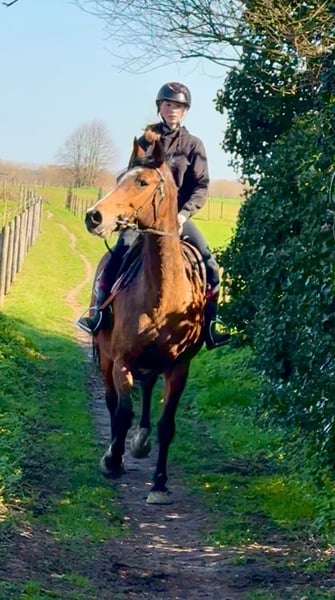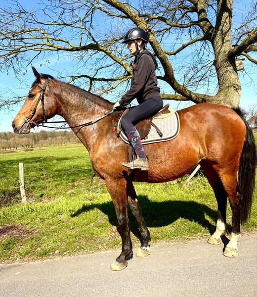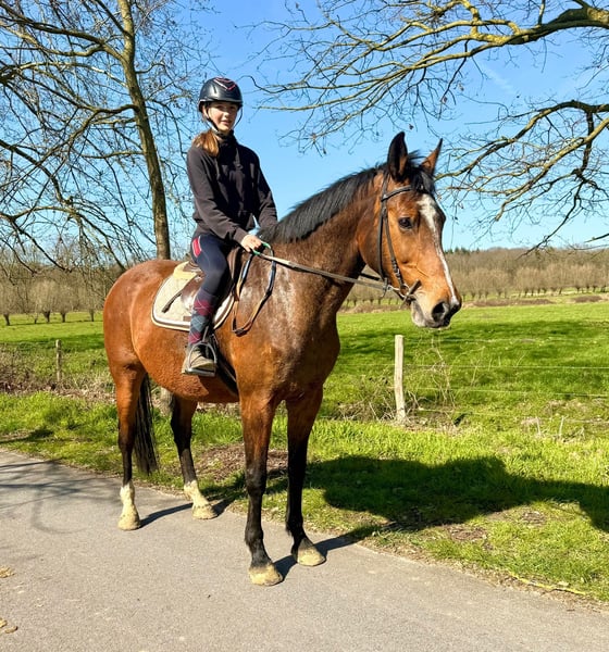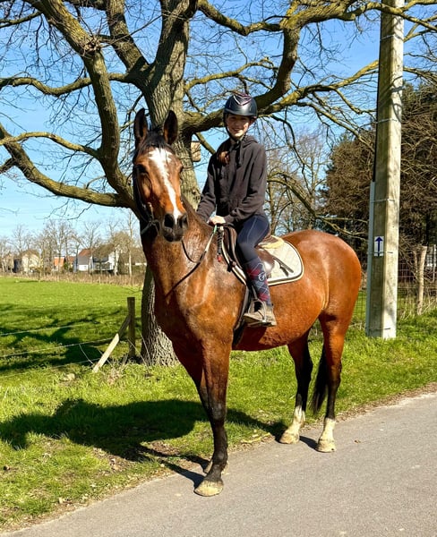 Groot - Stevig - Leerpaard ✨ Brave toffe merrie van 11jaar en meet +~175cm! Bwp merrie V: Va Vite - Heartbreaker Vm: Massimo - Cassini I Een leuke allrounder : loopt netjes dressuurmatig, kan springen kan op wandel - verkeersmak. Heeft nu enkele jaren stilgestaan omdat ze 2 veulens heeft gehad. Wij nemen het rijden terug rustig op en zal meelopen op wandelingen. Leuk leerpaard die haar werk kent. Reden: Vermindering paarden 0032496619693 Bornem Belgie www.stalcloverhof.be