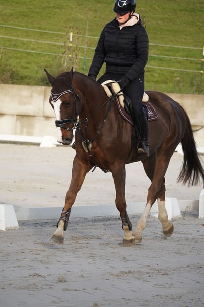 Scarlet, née en 2018, est une jument belge Warmblood d'environ 1,70 m, sosa Untochable, Heartbreaker, Up Chiqui, Heartbreaker. *Scarlet* est une jument extrêmement honnête, dotée d’une qualité exceptionnelle. Que ce soit pour le sport ou la promenade, elle procure un plaisir sans limite. Elle inspire confiance et sécurité. Scarlet peut également être utilisée comme cheval d’apprentissage pour le saut d’obstacles, où elle reste tout aussi sincère et facile à monter. Elle saute avec beaucoup de clairvoyance et de qualité, en essayant toujours de faire de son mieux. C’est pourquoi elle convient aussi parfaitement aux jeunes cavaliers ou aux cavaliers en transition de poney. Très calme et peu impressionnable, elle ne montre aucune nervosité face à de nouveaux environnements. En extérieur, seule ou en groupe, elle est très détendue et obéissante. Elle rassure également les cavaliers plus novices. En main, elle est câline et très bien éduquée. Un cheval de rêve. Écurie Dederichs – Votre partenaire pour l’achat de chevaux Contact & disponibilité : Les demandes doivent être faites exclusivement par téléphone au 0173/9792139. Lundi – Vendredi : 09h00 – 18h00 Samedi : 09h00 – 15h00 Dimanche : jour de repos Suivez-nous sur les réseaux sociaux ! Vivez notre quotidien avec nos chevaux à vendre sur Instagram, TikTok & Facebook via Écurie Dederichs. Remise : Pour toute acquisition immédiate de votre nouveau cheval de rêve, bénéficiez d’une remise de 5 % à 10 %. Essai et présentation : • Essai : 30 € par cheval (max. 2 cavaliers), le montant sera déduit en cas d’achat. • Jours fériés : essai à 50 €. • Présentation par nos entraîneurs : 25 € par cheval (montée en main, travail à pied, etc.). Examen préalable et transport : • Beaucoup de nos chevaux disposent déjà d’un examen vétérinaire préalable (AKU). • Vous pouvez bien sûr faire venir votre propre vétérinaire. • Nous organisons volontiers un examen. • Nous vous aidons également à organiser le transport vers votre nouveau domicile. Autres chevaux à vendre : D’autres chevaux sont disponibles dans notre élevage, mais ne sont pas encore en ligne. Si votre cheval de rêve n’est pas encore listé, n’hésitez pas à nous contacter. Informations importantes : • Les tailles approximatives sont estimées et non mesurées précisément. • Toutes les descriptions sont des appréciations subjectives du vendeur et ne constituent pas des garanties. Pour plus d’informations, veuillez consulter : www.Pferdehandlung-Dederichs.de