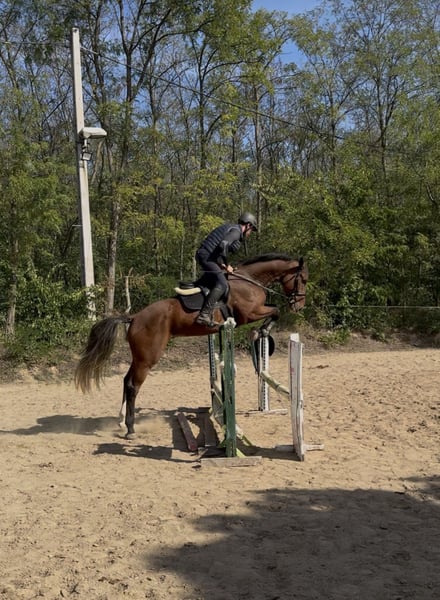 Pięcioletni, 175 cm wysokiego wałacha. Koń już brał udział w mniejszych zawodach, również z młodym jeźdźcem. W domu pewnie pokonuje parkur o wysokości 125 cm, a do tej pory próbowaliśmy pojedynczych przeszkód do 140 cm. Ma czyste zdjęcia RTG. Cena 15 000 €. Więcej informacji na WhatsApp: +36706774446 Lokalizacja: Węgry, Pest