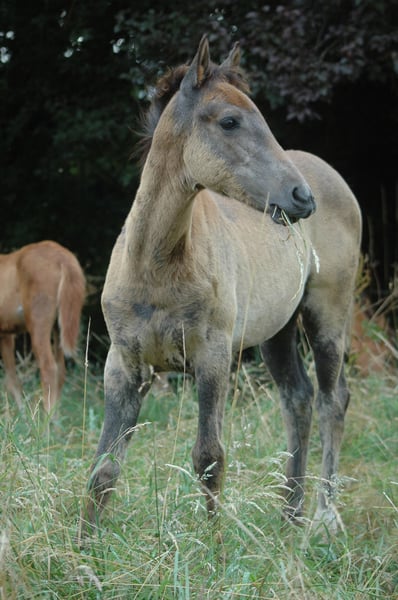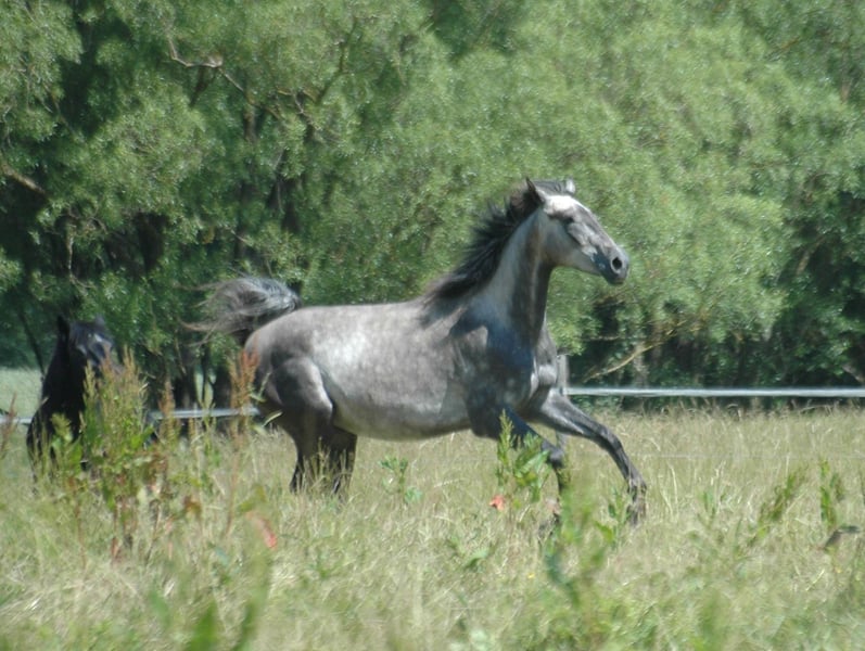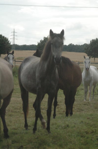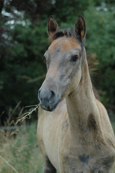 Berber mare Nisha al Aatik Sire: Hajri (TN) by Nadhif out of Teslia Dam: Elijah de Dienne (FR) by Pharid des Balmes out of Nate des Balmes She was born on April 28, 2023 as a bay and will be gray. Nisha is a foal with strong nerves. She is already able to express her own opinion, but is sensitive and very people-oriented. She is a spirited Berber mare, independent for her age and promises to grow up. Nisha loves to be close to people and because of her clear, spirited and intelligent character I can imagine her very well in horsemanship or working equitation. She is very typey, with a graceful face and long legs. Nisha needs a person who can offer her variety and develop her intelligence with a lot of empathy. Her Lahdjar influenced dam is an extremely easy to handle, gentle broodmare, from her sire Hajri (a bay stallion born and licensed in Tunisia) she has a stable foundation and a unique pedigree in Germany, which also makes her interesting for breeding. Nisha will have an estimated final height of approx. 1.56 m. She lives with her mother and siblings in our large, mixed-age herd. Nisha has been regularly wormed and vaccinated. A needs-based, mineral-rich diet is a matter of course for us. She has been trained from an early age in hoof trimming and leading. Contact and further information via WhatsApp 01578 1959559