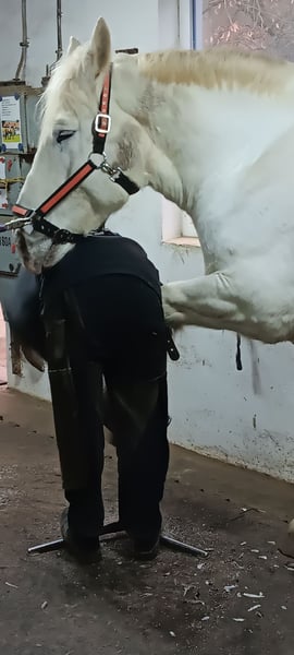 „Jimi“ ist ein Französisches Kaltblut Boulonnais mit deutschem Abstammungsnachweis (Pferdepass mit Abzeichen-Diagramm und Transponder). Sein Vater ist der bekannte Boulonnais „Jumper“ von Tamme Hanken – sicher allen aus dem TV bekannt. Geboren: 21.06.2016 Stockmaß: ca. 1,79 m geimpft, entwurmt, alle 6 Wochen vom Hufschmied bearbeitet, kein CPL - hat keine Raspe oder Mauke – gesunde Beine. Seit einiger Zeit Barhufer. Seine Augen sind windempfindlich und tropfen dann leicht. Jimi ist geritten (siehe Fotos): < Dressur auf dem Reitplatz < Geländeritte < mit Handpferd geht er auch ins Gelände Jimi ist eingefahren (siehe Fotos): < ein- und zweispännig < im Gelände/Straßenverkehr Jimi mag und kennt auch: < Bodenarbeit < Roundpen Arbeit < Longieren: Schritt, Trab und Galopp und Halten perfekt an der Longe < Säumen (Wandern mit Pferd) < Hängerfahren: hier steht er sehr ruhig und entspannt < schmiedefromm < Boxenhaltung, 24/7 Weidehaltung und auch Offenstallhaltung Jimi ist aufgrund seiner Größe im Umgang kein Anfängerpferd. Er ist lernwillig und ist bemüht alles richtig zu machen, wenn er das Vertrauen gewonnen hat. Er ist kein Langweiler. Wir haben uns entschlossen dieses hübsche Pferd doch zu verkaufen, weil ich mir eingestehen musste, dass ich für den richtigen Umgang mit ihm einfach zu klein (1,60 m/45 kg) bin. Daher möchte ich für ihn eine passendere Bezugsperson finden. Bei Interesse melden Sie sich gern: 0163 963 84 90