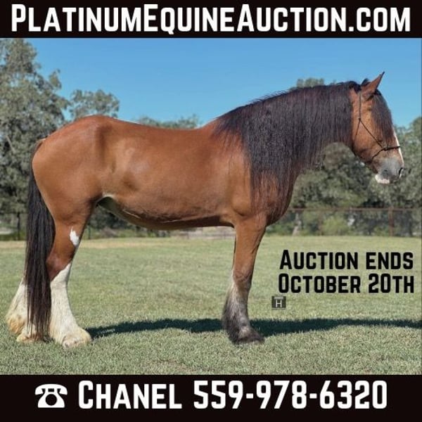 SUBASTA EN LÍNEA Realice sus pujas en www.PlatinumEquineAuction.com Oferta inicial $3500 La subasta finaliza el 20 de octubre de 2024 ¿Necesita una silla nueva? ¡Echa un vistazo a White Rock Saddles en nuestro sitio web o Facebook! Prada es una impresionante yegua Clydesdale de 17 manos de altura con una melena y cola para morirse. Ella es una explosión para montar y tan suave. Prada es suave y agradable de montar cada vez que la sacas para montarla - incluso con tiempo libre. Prada es atletica y sabe como usarse a si misma, tiene pies seguros y puede caminar, trotar y galopar como un caballito. Es suave de cara y se monta con un bocado sencillo. Tiene una excelente parada y mueve bien las piernas. Prada ha sido montada en los senderos y en el rancho la mayor parte de su vida y es una veterana. Sube, baja, pasa por encima y a través de cualquier cosa y es feliz saliendo sola o en grupo. La hemos llevado por la autopista y le hemos puesto todos los obstáculos que ha podido sin perder el ritmo. Prada te hará llamar la atención y mantendrá una sonrisa en tu cara todo el tiempo que la montes. Ella es buena en un pasto o un entorno estacionado, así como bien con los demás o solo. Es muy dulce e incluso baja la cabeza para que la puedas bridar y desbridar. ¡Ella es el sonido y un fácil de mantener! FMI llamada / texto Holland Horse Co. Chanel 559-978-6320. Situado en Jacksboro, TX. Feliz de responder a cualquier pregunta o ayudar a organizar el envío. SUBASTA EN LÍNEA Coloque sus ofertas en www.PlatinumEquineAuction.com Oferta inicial $ 3500 La subasta termina el 20 de octubre de 2024 ¿Necesita una nueva silla de montar? ¡Echa un vistazo a White Rock Saddles en nuestro sitio web o Facebook!