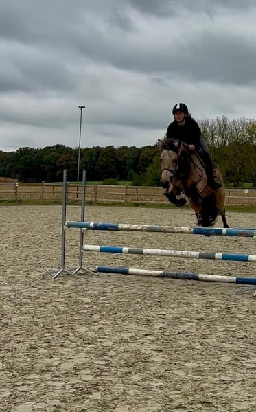 Connemara – 5-year-old mare – 14.2–14.3 hh Goldie is a particularly gentle and sweet 5-year-old Connemara mare with a beautiful, compact build. She is very pleasant to handle: social with other horses and completely free of typical mare behavior. She also travels very easily. Under saddle, Goldie has plenty of power and enthusiasm. She remains consistently well-behaved and is easy to control, but due to her forward temperament, she is especially suitable for experienced riders who enjoy riding with challenge and energy. In jumping, Goldie demonstrates great ability and enthusiasm. She effortlessly clears 4’0” (1.20 m), always with plenty of GO. She never refuses. Goldie was fully veterinary and clinical checked on 24/06/2025 (legs, back, and neck), with no remarks. 📞 More info: +32 475 68 22 43 🎥 Videos: available on our website (upon request)
