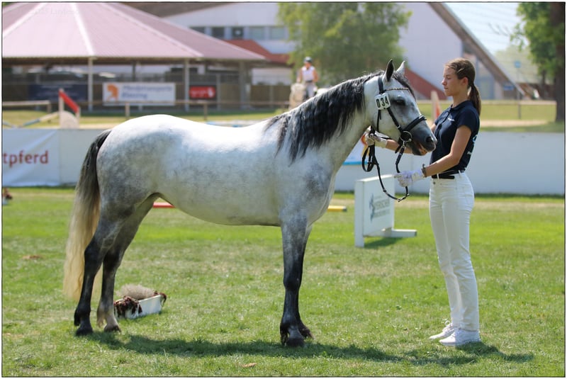 Lisbergs Lady Liberty Lisbergs Lady Liberty ist eine sehr schöne im Ponymass stehende Rappstute aktuell mit 1,43 m und wird die 1,48 m nicht überschreiten! Lisbergs Lady Liberty wurde am 12.06.2019 im schönen Lisberg morgens um 6.16 h geboren. Lisbergs Lady Liberty ihr HWSD-Status lautet N / N, dass heisst kein Träger und ideal zum Züchten auch mit seltenen Blutlinien der Rasse Connemara. Lisbergs Lady Liberty Mama ist Amy's Lady von Curraghakeen Cashel und mütterlicherseits von Westside Mirah und anderen Top-Vererbern der Connemara-Zucht. Die Mutter Amy's Lady ist auch eine leistungsgeprüfte Zuchtstute mit 7,68 zufällig das selbe Prüfungsergebnis wie Ihre Tochter Liberty. Liberty verfügt über ein gesundes Selbstbewusstsein welches ein gutes Sportpony für seine Zukunft braucht. Ihre 3 Grundgangarten sind ausdrucksstark mit guten Bewegungen schöner Balance, sie verfügt über eine gute Springmanier und hat auch auch schon ein paar kleine Sprünge mit dem Reiter absolviert. Liberty ist das ideale Pony für einen besseren Reiter, der viel mit seinen Pony lernen und erleben möchte. Sie wäre auch ein gutes Busch-Pony, da Liberty ein mutiges Pony ist. Lisbergs Lady Liberty ist bisher das einzigste Leistungsgeprüfte von dem Wirthsmühle Dark Diamond Pony. Dark wurde Siegerhengst der Sportponies bei der Körung am 10.03.18 – mit einer sensationellen Note von 8,0 im Körprotokoll! Leistungsprüfung sein enormes Vermögen, mit einer sensationellen Note von 8,7 Punkten. Zudem hat Dark im Januar 2023 auf der FN Bundesschau in Berlin die begehrte Bundesprämie erhalten. Liberty geht ganz nach Ihrem sportlichen Vater und hat all das liebenswerte und auch die Schönheit von Ihrer Mama Amy's Lady genau wie die sportliche Leistungsbereitschaft! Liberty ist Barhuf und liebt es sich in der Natur zu bewegen! Beim Auf- und Absitzen ist sie super entspannt! Auf Grund ihres guten Charakters und der Freundlichkeit gegenüber anderen Pferden und Hunden wäre sie auch ein gutes sicheres Geländepferd für einen nicht so starken Reiter auch mit Hund oder für die Reitjagd! Wir legen im Moment eher den Schwerpunkt in die Geländesicherheit und auf das Reiten im Strassenverkehr! Selbstverständlich geht Liberty auch alleine ins Gelände, kann zu einer Gruppe hin und auch wieder weg geritten werden und kommt mit dem Reiter auf dem Rücken wieder nach Hause! Liberty ist mit 7,68 Punkten in Ansbach am 25.04.2023 Leistungsgeprüft worden. Lisbergs Lady Liberty wurde bei der Stutbucheintragung am 17.05.2023 in Burgebrach mit 7,57 Punkten nach München zur Landesschau eingeladen! Auf der Landesschau erhielt unsere Lisbergs Lady Liberty den Titel Prämienstuten-Anwärterin und sind sehr stolz auf diese schöne typvolle junge Stute, danach schickten wir unsere Lisbergs Lady Liberty in die Sommerferien und jetzt ist sie frisch erholt aus Oberbayern zurück und die Arbeit beginnt langsam wieder. Liberty hat kein Sommerekzem und andere Unarten wie Weben oder Koppen! Lady reist gerne mit Pferdetransporter oder im LKW! Sie ist ein ideales Pony für Leute die es ein Pony im Ponymass möchten. Liberty verfügt über schöne raumgreifende Grundgangarten, wobei der Galopp besonders hervor sticht und in der Offenstallgruppe und im Panel-Boxenstall und in der Box benimmt sie sich hervorragend.Liberty ist sie grundimunisiert mit EHV 1,4 sowie Tetanus und Pferde-Influenza und regelmässig entwurmt! Leider passt unsere Lady nicht mehr in unser neues Zuchtkonzept, da sie mit unseren „neuen“ Connemara Hengst für unseren Geschmack zu ähnlich ist, daher jetzt der schwere Verkauf dieser weissen bayrischen irischen Elfe. Das komplette Pedigree von Lisbergs Lady Liberty finden Sie in der Abteilung Dokumente, da ehorses häufig die Abstammungen nicht komplett wiedergibt genauso wie Ihre Leistungsprüfung vom 25.04.2023. Nicht vergessen, darf man das Connemara Ponies erst mit 7-8 Jahren komplett ausgewachsen und entwickelt sind, daher ist eine altersgerechte Reiterei ein Garant für lange Freude am Pony! Gut gepflegte Connemaras sind langlebig und 30 Jahre ist keine Seltenheit bei der Rasse. Sollten Ihnen Lisbergs Lady Liberty gefallen, wenden Sie sich bitte direkt an die angegebenen Nummern aus der Anzeige und geben Sie bei einer email Ihren Namen und Ihre Mobilrufnummer an- gerne können Sie uns auch direkt über WhatsApp unter 00491713415878 kontaktieren, in unserem schönen Ort funktioniert das mobile telefonieren leider nicht oder nur sehr schlecht! Pro Besuch auf unseren Betrieb erheben wir eine Kennenlern-Pauschale von 50€ wochentags und 70€ an Sonn- und Feiertagen! Liebe Grüsse und vielleicht bis bald - Gestüt Lisbergs ist immer eine Reise wert!