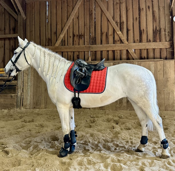 Cooperbeech Dutchess Cooperbeech Dutchess was born on 28.02.2018 at the famous and very well-known but fine Cooperbeech Connemara stud farm of Tomas and Fiona Grimes in beautiful Ireland. Cooperbeech Dutchess, came to us at our Lisbergs stud at the age of 2. Dutchess, as we call this beautiful gray mare with a final height of 1.47 m, is a dream, she loves people more than her own child. Dutchess had split a cheek tooth when she was 4 years old, which was removed from the inside at the "Stephansmühle" veterinary clinic, the aftercare and rinsing was carried out by the Bamberg veterinary clinic. That was many years ago without any consequences. Like all our horses, we have her dentally examined and treated once a year. Dutchess successfully passed her performance test in Ansbach on 16.11.2022 with a score of 7.18, she was ridden bitless until 2 days before the test due to her dental surgery and still felt a little uncomfortable with the double-broken ring snaffle at the time. Today, this is no longer a problem and Dutchess performs superbly with and without a bit at a good A dressage level. Dutchess is a registered broodmare and had a beautiful, very good, healthy colt by our Lettermuckoo Hazys in 2024. The little Lisbergs Hercules was weaned in October. As his mother loves people more than her own child, we have decided to sell our Dutchess as a Connemara riding pony! Unfortunately, shortly before weaning, little Hercules bit off the tails of all the broodmares in the loose stable one night. These are now growing back on every mare and this is unfortunately still clearly visible on Dutchess. Cooperbech Dutchess is a daughter of the very well-known GLENCARRIG KNIGHT, a stamp stallion of the Irish Connemara breed. Her dam COPPERBEECH STAR descends from CLONBERNE BOY a VILLAGE BOY son on her sire's side and from CURRACHMORE CASHEL and GLENCARRIG PRINCE on her dam's side, just to name a few very well-known ancestors in her pedigree. Dutchess's parents are both Class 1 and HWSD N/ N is registered in the 1st main studbook of the Hanoverian Pony and Small Horse Breeders' Association. Dutchess has no sweet itch or other abnormalities such as weaving or bucking! Dutchess travels very confidently with horse transporters or in trucks! She is an ideal pony for people who would like to have a larger and compact pony later on. Dutchess is a real Irish lady, always friendly - in the group she has good social behavior and avoids quarrels, but does not allow herself to be "bullied". Dutchess has beautiful ground-covering gaits and a very fine character in the open stable group and in the panel stall stable, she is vaccinated with EHV1.4 as well as tetanus and equine influenza and regularly dewormed. Due to her size, Dutchess is suitable for pony sport, pony games and, due to her calm nature, also for the therapeutic part of riding, as well as a riding horse for larger riders, as she is very sturdily built. The break and the later breaking in did her a lot of good both mentally and physically. Don't forget that Connemara ponies are not fully grown and developed until they are 7-8 years old, so age-appropriate riding is a guarantee that you will enjoy your pony for a long time! Well cared for Connemaras are long-lived and 30 years is not uncommon for the breed! Dutchess is well lunged and well ridden according to her age! However, we see Dutchess more as a dressage pony or family or therapy pony or show pony, as she knows how to present herself. Dutchess is barehoof! Dutchess loves to move in nature! She is super relaxed when mounting and dismounting! Due to her good character and friendliness towards other horses and dogs, she would also be a good safe cross-country horse for a not so strong rider with a dog or for riding hunts! Of course Dutchess also goes out alone, can be ridden to and from a group and comes home with the rider on her back! She is road-, cross-country- and traffic-safe even with weaker riders. Dutchess walks and trots well and also canters off-road, but in our small indoor arena and in the arena it is still difficult for her to canter with a rider for a long time due to her lack of muscles and ballance (mother time!)! If you like Cooperbeech Dutchess, please contact us directly at the numbers given in the ad and include your name and mobile phone number in an email - you are also welcome to contact us directly via WhatsApp at 00491713415878, unfortunately mobile telephony does not work or only very poorly in our beautiful town. On the last picture you can see Dutchess father Glencarrig Knight. The complete pedigree can be found in the documents, as ehorses often swallow parts of the pedigree. We charge an introductory fee of 50€ per visit to our farm and 70€ on Sundays and public holidays must be paid in cash in advance on arrival! Best regards and maybe see you soon - Gestüt Lisbergs is always worth a visit! Lisbergs Stud
