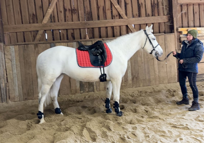 Cooperbeech Dutchess Cooperbeech Dutchess wurde am 28.02.2018 auf dem berühmten und sehr bekannten, aber feinen Cooperbeech Connemara Gestüt von Tomas und Fiona Grimes im schönen Irland geboren. Cooperbeech Dutchess, kam mit 2 Jahren zu uns auf unser Gestüt Lisbergs. Dutchess wie wir diese schöne Schimmelstute im Endmass von 1,47 m nennen und rufen, ist ein Traum, sie liebt die Menschen mehr als Ihr eigenes Kind. Dutchess hatte 4jährige Stute sich einen Backen-Zahn gespalten, der in der Tierklinik "Stephansmühle" von innen entfernt wurde, die Nachbehandlungen und Spülungen wurden von der Tierklinik Bamberg übernommen. Das ist inzwischen schon viele Jahre her ohne Folgen. Wir lassen Sie wie alle unsere Pferde einmal jährlich zahntechnisch untersuchen und behandeln. Dutchess hat am 16.11.2022 Ihre Leistungsprüfung in Ansbach erfolgreich mit 7,18 abgelegt, sie wurde bis 2 Tage vor der Prüfung auf Grund Ihrer Zahn-Op gebisslos geritten und fühlte sich damals mit der doppelt gebrochenen Ringtrense noch etwas unwohl. Heute ist das alles kein Problem mehr und Dutchess läuft super mit und ohne Gebiss auf guten A-Dressur-Niveau. Dutchess ist eingetragene Zuchtstute und hatte in 2024 ein wunderschönes sehr gutes gesundes Hengstfohlen von unserem Lettermuckoo Hazys. Der kleine Lisbergs Hercules wurde im Oktober abgesetzt. Da seine Mutter die Menschen mehr liebt, als das eigene Kind, haben wir uns dazu entschlossen unsere Dutchess als Connemara-Reitpony zu verkaufen! Leider hat der kleine Hercules, kurz vor dem Absetzen in einer Nacht, allen Zuchtstuten im Laufstall die Schweife abgebissen, diese wachsen jetzt bei jeder Stute nach und dies ist auch leider bei Dutchess noch deutlich zu sehen. Cooperbech Dutchess ist eine Tochter des sehr bekannten GLENCARRIG KNIGHT einen Stempelhengst der Irischen Connemara Zucht. Ihre Mutter COPPERBEECH STAR stammt ab von CLONBERNE BOY einen VILLAGE BOY-Sohn väterlicherseits und mütterlicherseits von CURRACHMORE CASHEL und GLENCARRIG PRINCE, nur um ein paar sehr bekannte Vorfahren in Ihrem Pedigree zu nennen. Dutchess's Eltern sind beide Class 1 und HWSD N/ N ist eingetragen ins 1 Hauptstammbuch des Verbandes der Pony- und Kleinpferdezüchter Hannover. Dutchess hat kein Sommerekzem und andere Unarten wie Weben oder Koppen! Dutchess reist reist sehr souverän mit Pferdetransporter oder im LKW! Sie ist ein ideales Pony für Leute die es später gerne grösser und kompakt haben möchten. Dutchess ist im Umgang eine echte irische Lady, immer freundlich - in der Gruppe verfügt sie über ein gutes Sozialverhalten und geht Streitigkeiten aus dem Weg, lässt sich aber nicht „mobben“. Dutchess verfügt über schöne raumgreifende Grundgangarten und einen sehr feinen Charakter in der Offenstallgruppe und im Panel-Boxenstall ist sie grundimunisiert mit EHV1,4 sowie Tetanus und Pferde-Influenza und regelmässig entwurmt. Dutchess eignet sich durch die Grösse für den Ponysport, Ponyspiele und durch ihre ruhige Art auch für den Therapeutischen Part der Reiterei, sowie als Reitpferd für grössere Reiter, da sie sehr stabil gebaut ist. Die Pause und das spätere Anreiten, hat ihr mental und körperlich sehr gut getan. Nicht vergessen, darf man das Connemara Ponies erst mit 7-8 Jahren komplett ausgewachsen und entwickelt sind, daher ist eine altersgerechte Reiterei ein Garant für lange Freude am Pony! Gut gepflegte Connemaras sind langlebig und 30 Jahre ist keine Seltenheit bei der Rasse! Dutchess ist gut longiert, artig altersgerecht geritten! Dutchess sehen wir allerdings, eher als Dressurpony oder Familien- oder Therapie-Pony oder Show-Pony, da sie es weiss sich zu präsentieren. Dutchess ist Barhuf! Dutchess liebt es sich in der Natur zu bewegen! Beim Auf- und Absitzen ist sie super entspannt! Auf Grund ihres guten Charakters und der Freundlichkeit gegenüber anderen Pferden und Hunden wäre sie auch ein gutes sicheres Geländepferd für einen nicht so starken Reiter auch mit Hund oder für die Reitjagd! Selbstverständlich geht Dutchess auch alleine ins Gelände, kann zu einer Gruppe hin und auch wieder weg geritten werden und kommt mit dem Reiter auf dem Rücken wieder nach Hause! Sie ist strassen-, gelände- und verkehrssicher auch mit schwächeren Reiter. Dutchess geht brav in Schritt und Trab und galoppiert auch im Gelände, allerdings in unser kleinen Halle und auf dem Platz fällt es ihr noch manchmal schwer den Galopp lange zu halten, aber im Gelände ist sie traumhaft lange zu galoppieren. Sollten Ihnen Cooperbeech Dutchess gefallen, wenden Sie sich bitte direkt an die angegebenen Nummern aus der Anzeige und geben Sie bei einer email Ihren Namen und Ihre Mobilrufnummer an- gerne können Sie uns auch direkt über WhatsApp unter 00491713415878 kontaktieren, in unserem schönen Ort funktioniert das mobile telefonieren leider nicht oder nur sehr schlecht. Auf dem letzten Bild ist Dutchess Vater Glencarrig Knight zu sehen. Das komplette Pedigree finden Sie in den Dokumenten wieder, da ehorses häufig Teile der Abstammung verschluckt. Pro Besuch auf unseren Betrieb erheben wir eine Kennenlern-Pauschale von 50€ und 70€ an Sonn- und Feiertagen müssen vorab bei Ankunft entrichtet werden in bar! Liebe Grüsse und vielleicht bis bald - Gestüt Lisbergs ist immer eine Reise wert! Gestüt Lisbergs