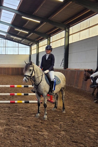 River ist eine 9-jährige C-Pony-Stute, gemessen bei 1,36 m (KNHS). Sie wirkt größer als sie ist, daher ist sie ein Pony, auf dem man lange reiten kann. Sie ist ein angenehm zu reitendes Pony, das in allen Disziplinen zuhause ist, und besitzt zudem ein äußerst liebenswertes Wesen. Mit ihr kann man schön dressurmäßig arbeiten, sie genießt Ausritte im Gelände, hat bereits Erfahrung im Cross, aber am liebsten springt sie. In den letzten Monaten hat sie bei Auswahlprüfungen mit einem jungen Reiter mitgemacht, bei denen sie mehrfach Platzierungen erzielte und sich für die Brabantse Kampioenschappen springen qualifizierte. Zu Hause springt sie problemlos Parcours bis 80 cm und läuft fast immer fehlerfrei. Ein Pony, das keine Hufeisen berührt und gut mitdenkt. Wir wünschen uns für sie einen Reiter, der die sportliche Karriere mit ihr weiterführen möchte. River besitzt einen Pass, ist halb Connemara, gechippt und ist in Bezug auf Impfungen etc. in Ordnung. Außerdem wurde sie röntgenologisch untersucht, mit guten Bildern. Selbstverständlich können alle weiteren Untersuchungen wiederholt werden. K.K. Besichtigung in Etten-Leur.