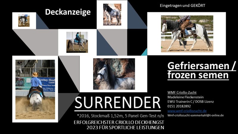 ¡¡¡ANUNCIO DE PORTADA !!! Le ofrecemos un semental de pura raza Overo Criollo de primera clase para sus yeguas en semen congelado, semen fresco y salto natural. DESCUENTO hasta el 15.02.2025 por 700 Surrender es actualmente el semental Criollo con más éxito en las disciplinas Reining, Ranch Riding y Ranch Rail. Domina todas las maniobras mientras duerme y está extremadamente dispuesto a rendir, así como absolutamente centrado e increíblemente dispuesto a aprender. Incluso los miembros más jóvenes de nuestra familia pueden acicalar, guiar o montar a Surrender sin ningún problema. Hechiza a personas y animales con su carácter cariñoso. Transmite a su descendencia no sólo su correcta conformación y sus bellas variaciones de color, sino también su carácter increíblemente tranquilo y enérgico. Las últimas fotos muestran una pequeña selección de su descendencia. Surrender se presenta en todos los colores, ya sea overo de todos los colores, pinto de todos los colores, grullo (mouse dun), azul ruano (moro), negro, bayo, tigre pinto y muchos más. Numerosas victorias y clasificaciones en Reining, Ranch Riding y Ranch Rail. Finalista del Open de Alemania. ¡Nuestro Surrender NO puede engendrar zorros! 5 Panel genético n/n ¡Ven a ver nuestra maravilla de colores por ti mismo! www.wmf-criollozucht.de 015120182892 Madeleine Fleckenstein Entrenadora de equitación occidental de la EWU