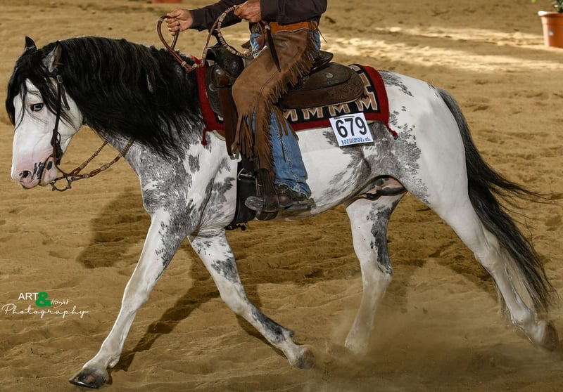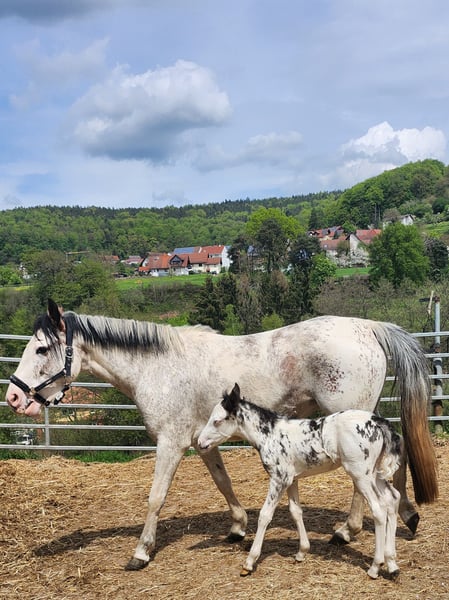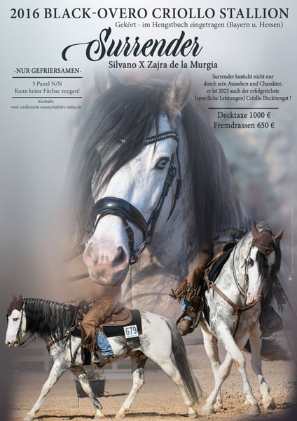 COVER DISPLAY !!! We offer you a first class purebred Overo Criollo stallion for your mares in frozen semen, fresh semen and natural jump. DISCOUNT until 15.02.2025 for 700 € Surrender is currently the most successful Criollo stallion in the disciplines Reining, Ranch Riding and Ranch Rail. He masters all maneuvers in his sleep and is extremely willing to perform as well as absolutely focused and incredibly willing to learn. Even the youngest members of our family can groom, lead or ride Surrender without any problems. He captivates people and animals alike with his loving nature. He passes on to his offspring not only his correct conformation and beautiful color variations, but also his incredibly calm and strong-nerved character. The last photos show a small selection of his offspring. Everything is possible with Surrender, whether overo of all colors, pinto of all colors, grullo (mouse dun), blue roan (moro), black, bay, tiger pinto and much more. Numerous victories and placings in Reining, Ranch Riding and Ranch Rail. German Open Finalist ! Our Surrender can NOT sire foxes! 5 Panel gene test n/n Come by and see our colorful wonder for yourself! www.wmf-criollozucht.de 015120182892 Madeleine Fleckenstein EWU Western Riding Trainer