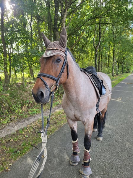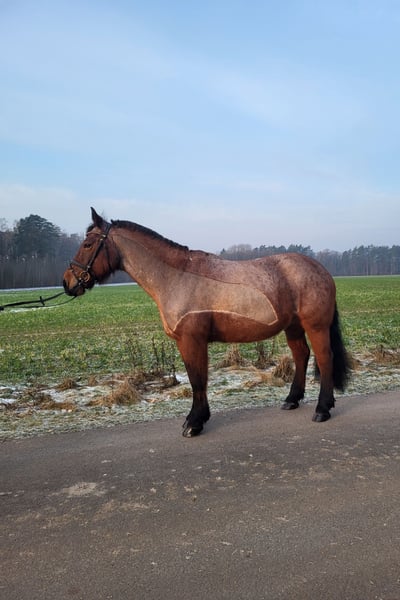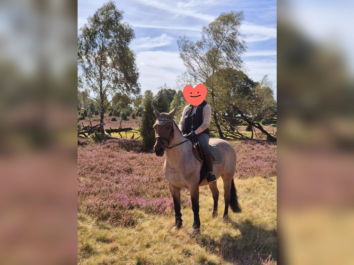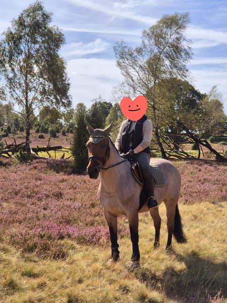 For sale is my beloved Criollo Mix mare Pebbles, born on April 8th, 2011. She stands approximately 155 cm at the withers and is listed as a bay with a roan pattern, which I would describe as a roan red. She is regularly ridden by me in dressage (training level A) and in the outdoor arena. She is comfortable both riding alone and in a group. It doesn’t matter which position you ride her from — she remains relaxed and manageable (even in canter). She has also participated in a hunt, crossing open terrain, and remained calm throughout. Bucking is completely foreign to her! Overall, she is a horse with a rather laid-back nature and little forward impulsion. Pebbles is trained in some classical dressage movements, such as the Spanish walk and lying down. She is very easy to load and stands calmly on the trailer. Of course, she has been regularly dewormed and vaccinated. Her teeth were checked and treated in May 2025. Additionally, she is regularly seen by the farrier (front shoes only) and is very well behaved for the blacksmith. Pebbles has been in my possession for a year. I am only selling her for personal reasons, to place her in the best hands. Her previous owner bought her in October 2022 after a mild ligament injury (she sustained a wound from grazing), which has now healed. She also has a mild summer eczema, which has been hardly noticeable with proper care (e.g., eczema blanket). In the past (about six years ago), Pebbles was used as a knight’s tournament/show horse, as well as for jumping (A**) and trail riding (A**). However, I have not continued to train her in these disciplines. Pebbles is a wonderful horse for riders seeking a reliable leisure partner with good training and experience. However, she is not suitable as a beginner’s horse, as she can sometimes become a bit stubborn. To avoid riding tourism and because she is too good for that, I will charge a fee of €25 for trial riding, which will be deducted from the purchase price. Written inquiries will not be answered; I look forward to a call at 0162 2183122.