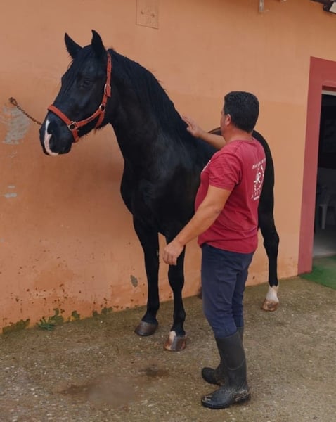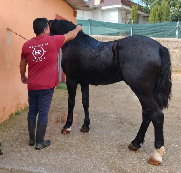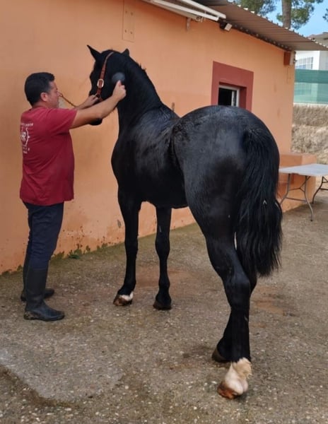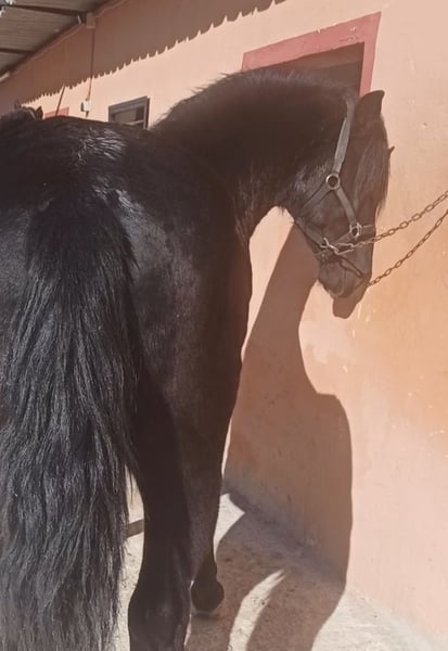 Hispano-Friesian with Passport. Black Coat Age: 3.5 years, intact Baroque type, height approximately 1.57 m (growing) Gentle in handling, grooming, bathing, etc. Currently in the process of breaking and training, not yet ridden. Veterinary check-up OK Vaccinated and dewormed Veterinary examination and trial period at the riding school are accepted. Viewing by appointment only. Transport arrangements possible, both national and international. Francisco ☎️ +34 630 843 283