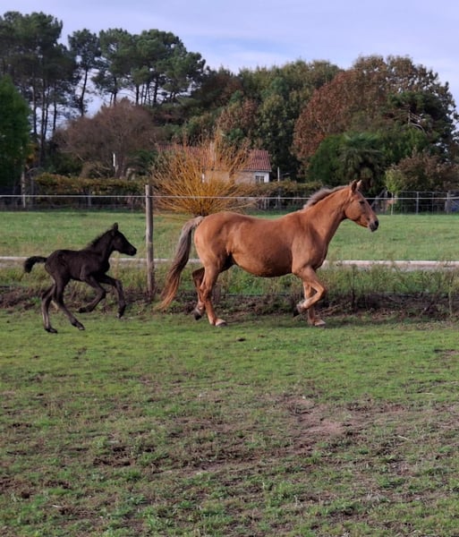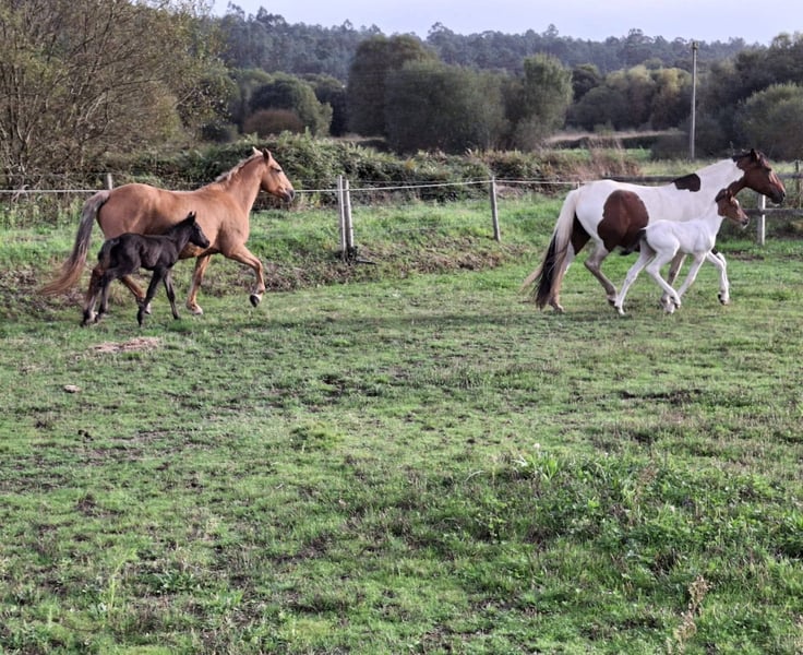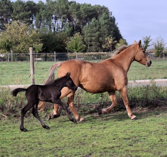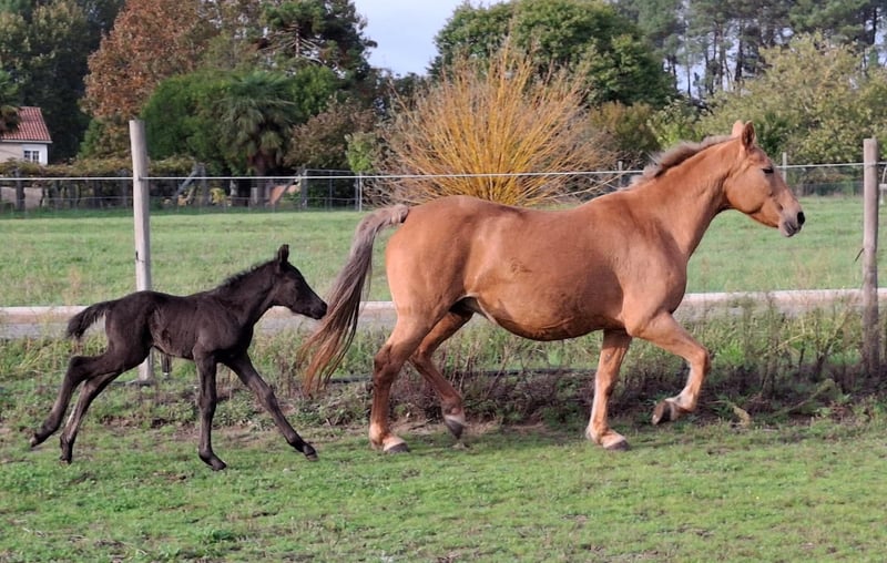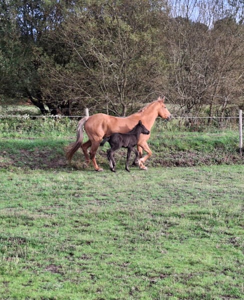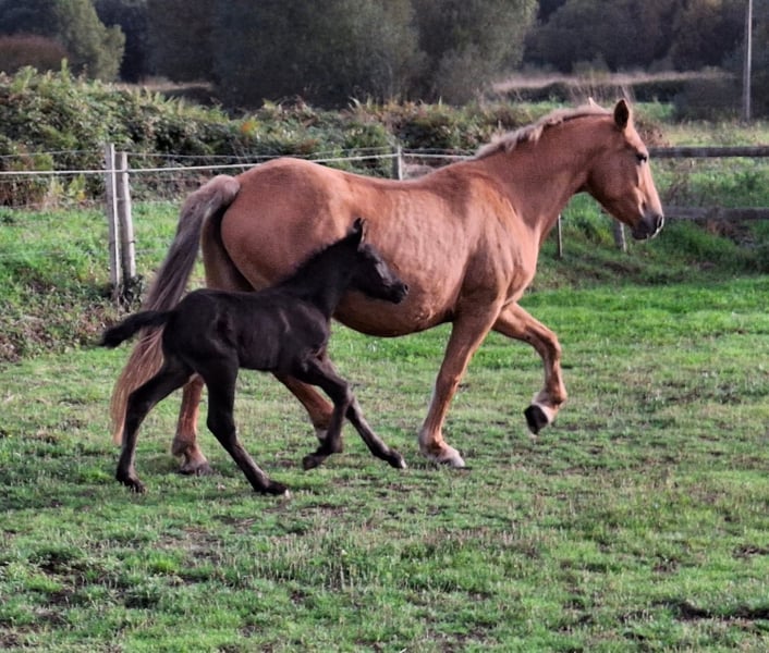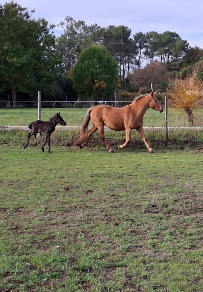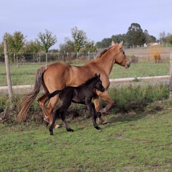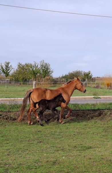Te koop: merrie met een fantastisch karakter, gereden met haute école-oefeningen, met een pasgeboren veulen. Zeer bijzondere aftekeningen. Foto van de vader: een puur Spaanse rijpaard met een zwarte vacht.