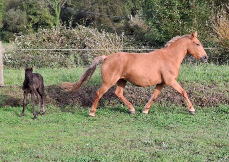 For sale: Mare with a fabulous temperament, trained in haute école movements. She is riding well and has a recently born foal. The sire is an exceptional purebred Spanish horse with a black coat. Photos available.