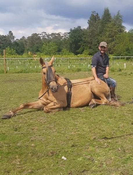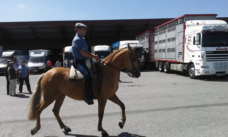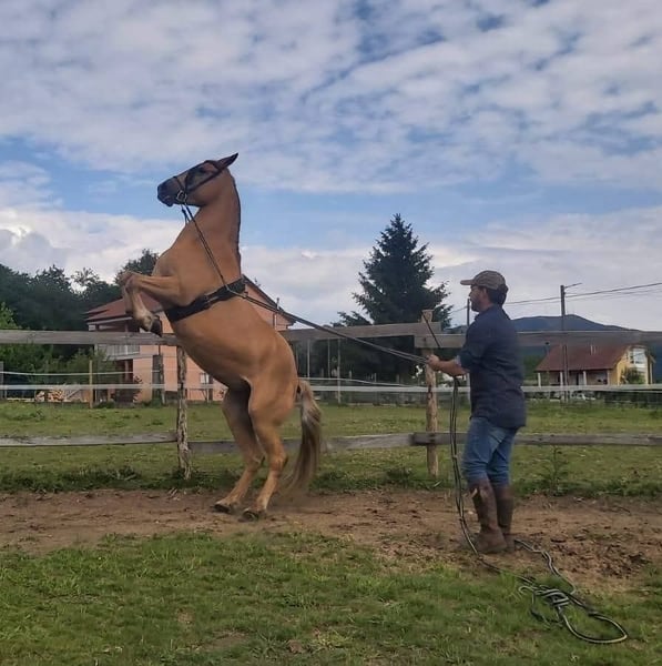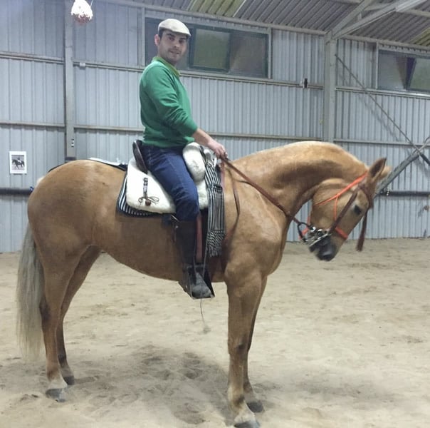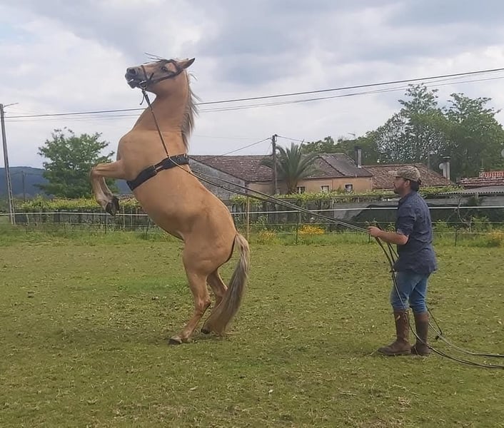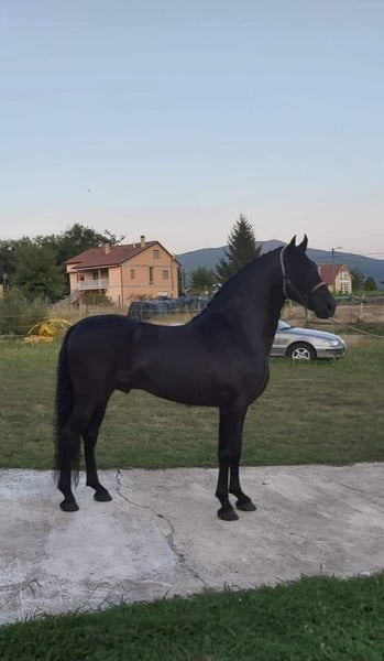 Verkauft wird eine Stute mit fabulösem Temperament, ausgebildet in der klassischen Dressur mit hochschulähnlichen Übungen. Sie ist tragend von einem kürzlich geborenen Fohlen. Das Pferd besitzt eine besondere Fellfarbe. Im Bild ist der Vater zu sehen, ein reinrassiger spanischer Pferdehengst mit schwarzem Fell.