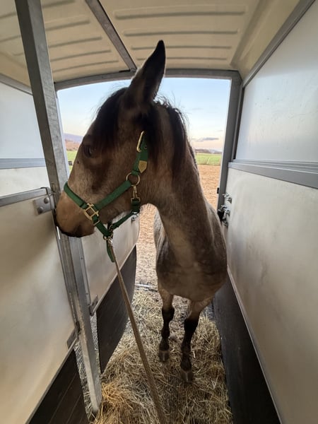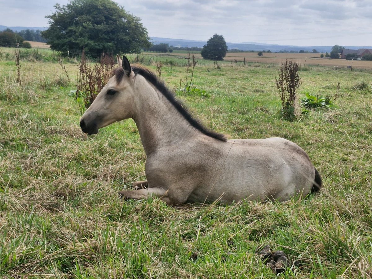 Ich biete hier eine junge Buckskin Quarter–Lusitano-Stute (Azteka-Typ) an, die im April ein Jahr alt wird. Sie stammt aus einer Blue-Roan Foundation-Quarter-Horse-Stute aus der Hancock-Linie. Die Mutter (Stkm 1,55m) ist freundlich im Umgang, sehr rittig und klar im Kopf und kann vor Ort besichtigt werden. Ihr Vater ist ein cremellofarbener Lusitano (Stkm. 1,54 m) der Ausdruck, Präsenz und Qualität in der Bewegung mitbringt. Die junge Stute zeigt sich aufmerksam, selbstbewusst und mit einer schönen inneren Stabilität. Sie bringt eine gute Mischung aus Ruhe und Reaktionsfähigkeit mit und wächst artgerecht in der Herde auf. Perspektivisch sehe ich sie in der Working Equitation, in der altkalifornischen Reitweise oder auch in der Rinderarbeit. Ebenso kann ich sie mir bei einem ambitionierten Freizeitreiter vorstellen. Aktuell kennt sie das Fohlen-ABC, kennt Hunde, Trecker, Kettensägen und verschiedene Planen. Sie ist schmiedefromm, regelmäßig entwurmt und vollständig geimpft. Die letzten Bilder zeigen ihre Eltern. Bei ernsthaftem Interesse freue ich mich über eine persönliche Nachricht.