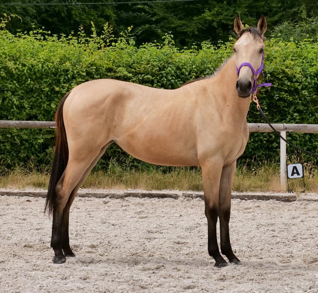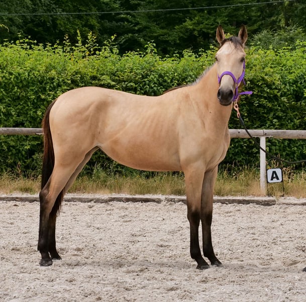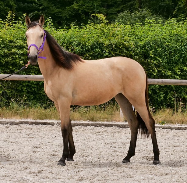 Name: Bonita Rasse: Cruzado Geschlecht: Stute Geburtsdatum: 27.03.2024 Alter: 1 Stockmaß: 1.36m Farbe: Falbe Abstammung: ohne Abstammungsnachweis Charakter: menschenbezogen, geduldig, neugierig, intelligent, mutig, lernwillig Ausbildung/Eignung: Fohlen Geländeerfahrung: keine Gesundheit: entwurmt, geimpft, Barhufer, ekzemfrei, Zähne kontrolliert Haltung: Offenstall Besonderheiten: sehr schöne Grundgangarten, schmiede und verladefromm, herdenverträglich Die genannten Eigenschaften beruhen auf unserer persönlichen Einschätzung und stellen keine zugesicherten Merkmale dar. Preis: 4900€ (Bruttopreis) Haben wir ihr Interesse geweckt? Um Ihnen einen besseren Eindruck von Bonita zu geben, senden wir Ihnen sehr gerne ihr Video zu. Selbstverständlich stehen wir Ihnen für eine ausführliche Beschreibung des Pferdes, persönliche Beratung und zur Beantwortung aller Ihrer Fragen auch telefonisch zur Verfügung. Bitte schreiben Sie uns hierfür jederzeit eine WhatsApp Nachricht, oder rufen unter folgender Telefonnummer an: +49 15119487595 Unsere Telefonzeiten sind täglich von 7:00 - 13:30 sowie ab 20:00Uhr. Wir freuen uns über Ihre Kontaktaufnahme! Eine klinische oder Röntgenologische Ankaufsuntersuchung kann gerne vom Tierarzt Ihrer Wahl durchgeführt werden. Natürlich kann Bonita sicher und komfortabel in ihr neues Zuhause geliefert werden. Wir kümmern uns um alle notwendigen Vorbereitungen und den Transport, damit Ihr neues Pferd stressfrei, gut betreut, versichert und wohlbehalten im neuen Zuhause ankommt. Zurzeit präsentieren wir eine sorgfältig ausgewählte Vielfalt an Verkaufspferden. Bei uns finden Sie garantiert Ihr Traumpferd. Besuchen Sie uns auch gerne auf unserer Homepage unter: www.marvinsroyalhorses.de. Sehr geehrte Kunden, gerne stellen wir Ihnen unsere Pferde vor und führen, putzen, satteln, longieren, Bodenarbeit sowie Probereiten in der Reithalle, auf dem Platz oder im Gelände ist Ihnen möglich, um Ihr neues Familienmitglied näher kennenzulernen. Dieses kostet für ein Pferd 40€, für jedes weitere 30€ und wird beim Kauf wieder erstattet. Unsere Adresse lautet: Grube Ferdinand 50 53577 Neustadt Wied Google Maps: marvinsroyalhorses