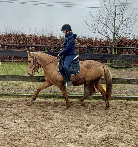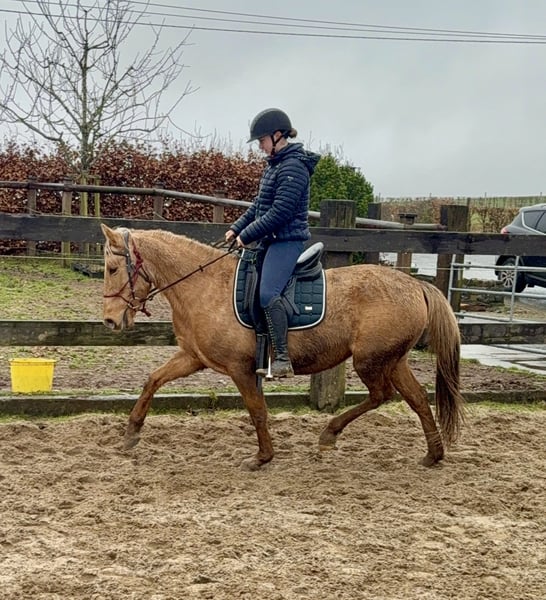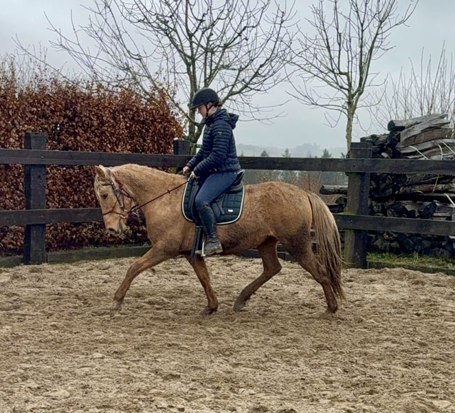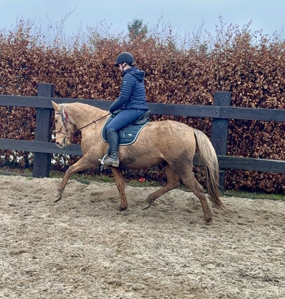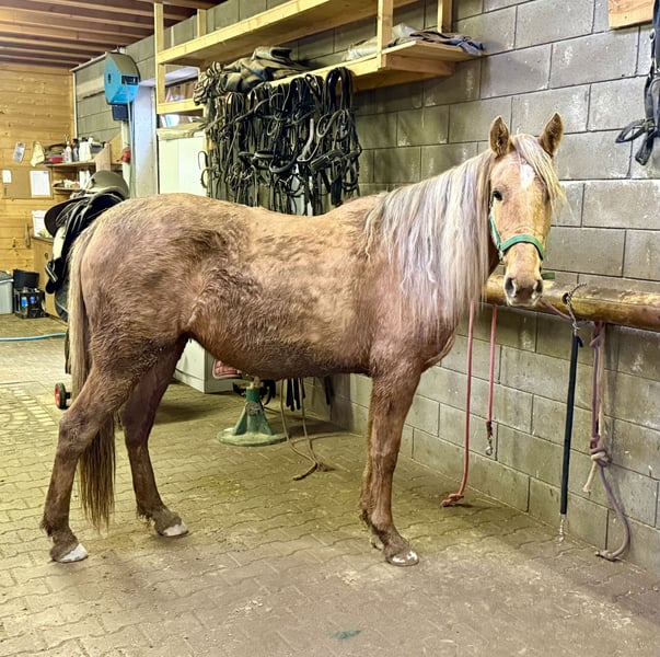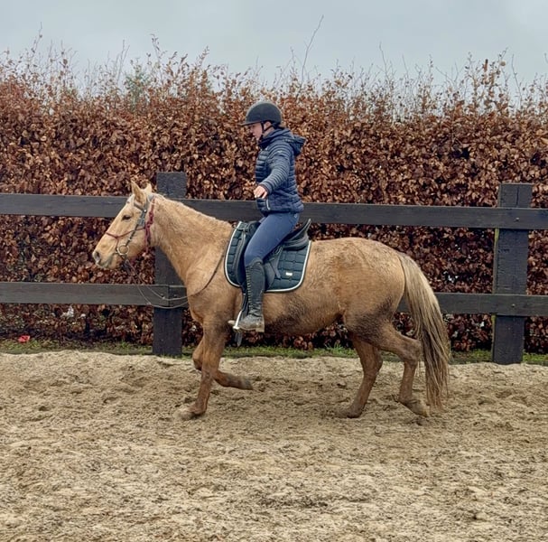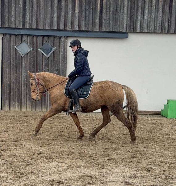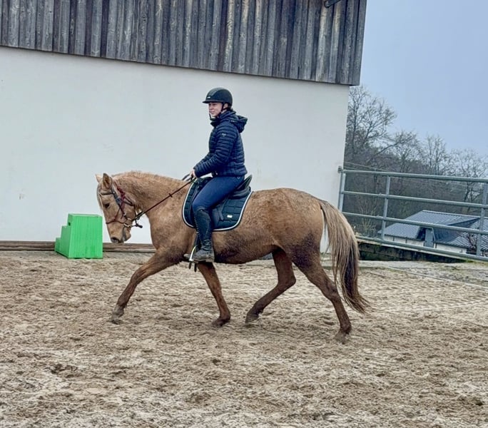 Zum Verkauf steht eine 4,5 Jahre alte, etwa 151cm große Stute in der tollen Farbe Dunalino ohne Abstammung. Sie ist gut freizeitmäßig geritten und zeigt sich sehr talentiert bei der dressurmäßigen Arbeit auf dem Reitplatz. Kleine Sprünge meistert sie auch ohne Probleme. Dies kann natürlich noch weitere ausgebaut werden. Sie zeigt keine Unarten unter dem Sattel und ist ziemlich einfach zu reiten. Daher wäre sie bestimmt auch für eine Reitschule interessant. Im Umgang ist sie ebenfalls absolut unkompliziert und brav. Sie lebt bei uns im Offenstall und ist sehr verträglich auch in der gemischten Herde. Sie kann robust gehalten werden, kennt aber auch die Box. Krankheiten oder Allergien sind nicht bekannt. Eine AKU darf gerne gemacht werden. Für das Probereiten, Vorreiten oder anderes Ausprobieren des Pferdes berechnen wir 35€. Beim Kauf wird dies gutgeschrieben. Gerne anrufen oder eine Nachricht senden 0157 36803742 Alle Angaben ohne Gewähr, Preisänderungen vorbehalten, Transport möglich, Onlinekauf möglich