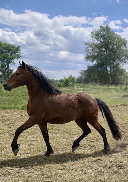American Bashkir Curly mare, born in 2022, approximately 14.1 hh – with exceptional movement and a lot of personality With a heavy heart – for personal reasons – I am seeking a suitable, long-term home for my American Bashkir Curly mare. This is not an urgent sale. She is a young, very alert and personable mare with a strong presence. Curious, playful, yet attentive and sensitive in handling. She enjoys human contact very much and willingly allows grooming and handling. She is well-behaved, halter-trained, and easily led. She handles solo walks with her handler confidently and calmly. She is already familiar with ground work, as well as various environmental stimuli such as cars, dogs, and children. She was raised in a herd and is accustomed to both pasture and stable with paddock. She is very tidy in her stable. Within the herd, she establishes herself confidently and shows self-assurance. Farrier and veterinarian visits are no problem for her. She is loading well, healthy, vaccinated, and in excellent condition. Currently, she is being gradually and gently prepared for further training, appropriate to her age. Her movement is particularly noteworthy: She demonstrates good scope, rhythm, and a smooth, supple gait with additional quality. Color: Brown with year-round lightly curly Curly coat, dark legs Height: approx. 14.1 hh Awarded as a foal at licensing. Pedigree available; details gladly upon request. Transport can be arranged at an additional cost. Accessories can also be provided for an extra fee. Regularly vaccinated, dewormed, and in good health. The last three photos show her parents. Deliah Sire: Django – Black (Rappe) Dam: Desba – Brown