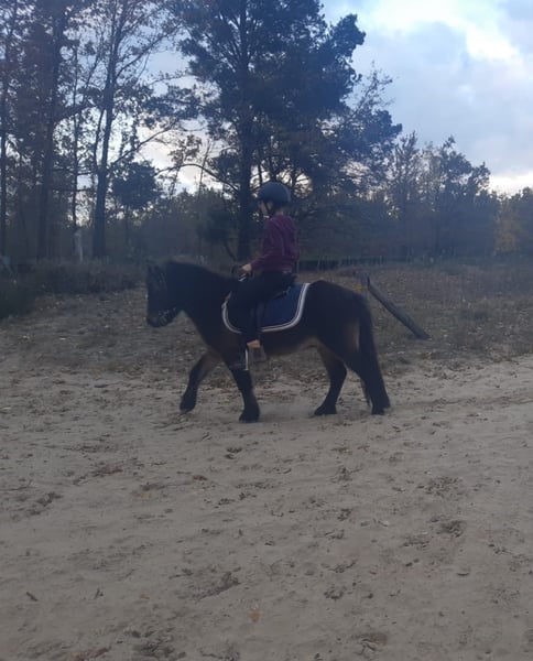 Met pijn in het hart geven wij onze kleine 9-jarige Dartmoor ruin weg, omdat de wisselende ruiters in onze paardrij-educatieschool hem te veel stress bezorgen. Hij zoekt een veilige vertrouwenspersoon en wordt daarom momenteel niet alleen als kinderpony aangeboden. - Ingeënt op 5-jarige leeftijd door een pony-instructrice (dus niet alleen door "goed rijdende" kinderen) - Tot voor kort gereden door een 13-jarige rijderspartner op de piste en in het terrein, in alle gangen - Mooie bewegingen, talentvol in springen - Kent longe, dubbele longe en vrijheidsdressuur - Is bekend met clickertraining en training met de paardenwip - Zeer oplettend en nieuwsgierig, reageert op subtiele signalen - Houdt van water (laat zich graag douchen) en is gemotiveerd in het terrein - Schoon en verlading-proof - Tot nu toe nooit ziek geweest, afgezien van een klein handicap: patellaluxatie (knieprobleem), dat hem bij regelmatig trainen (spieropbouw) niet beperkt - In de kudde altijd ranghoog, maar sociaal en speelt graag met andere hengsten Voorkeur voor verkoop als grondwerkpony of als bijzitter voor volwassenen, eventueel ook voor een lichtgevorderde jeugd of een niet geheel onervaren kind, als rijpony in combinatie met een ervaren volwassene.