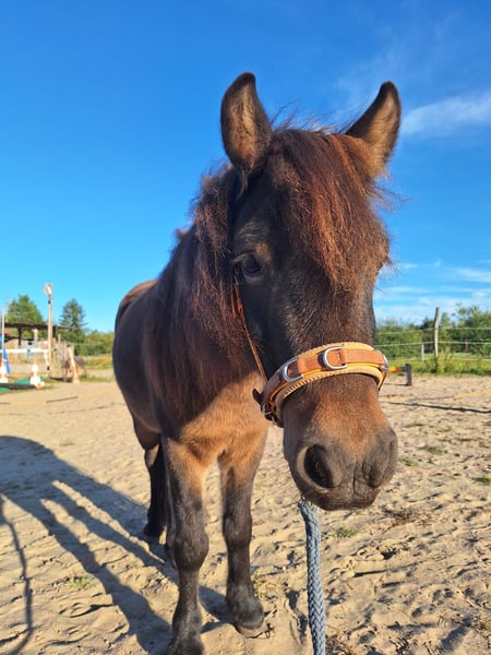 Schweren Herzens geben wir unseren 1,17m kleinen 9jährigen Ponywallach( kein Abstammungsnachweis, nach Vorbesitzer-Angaben ein Dartmoorpony) ab, da ihn die wechselnden Reiter und der Umgang mit Kindergruppen in unserer Reitpädagogikschule zu sehr stressen. Er sucht daher eine erfahrene Bezugsperson, die seine sensible Persönlichkeit zu schätzen weiß und auf ihn eingeht. -5jährig eingeritten durch Pony-Bereiterin (also nicht nur durch "bereits gut reitende" Kinder) -Bis vor kurzem durch eine 10 und eine 13 jährige Reitbeteiligung (sind nun leider rausgewachsen) geritten in allen Gangarten auf dem Platz und im Gelände. - zuverlässig beim geführten Reiten, auch im Gelände - lässt sich von etwas erfahrenen Kindern auch gut frei reiten - im Umgang braucht er eine sichere Person (bei ernsthaftem Interesse gerne mehr im persönlichen Gespräch) - kennt Longe, Doppellonge, Freiarbeit, Klassische Handarbeit und Langzügel - kennt clickern und Training mit der Pferdewippe - sehr aufmerksam und neugierig, reagiert auf feine Signale - mag Wasser (lässt sich gerne duschen) und ist motiviert im Gelände unterwegs - schmiede- und verladefromm - bei uns bisher nie krank, bis auf kleines Handicap- Patellaluxation (Knieprobleme ) , dieses schränkt ihn bei regelmäßigem Training (Muskelaufbau) nicht ein - regelmäßig geimpft, entwurmt und einmal jährlich Zähne gemacht - in der (gemischten) Herde bisher immer recht ranghoch aber sozial, spielt gerne mit anderen Wallachen Abgabe am liebsten als Bodenarbeitspony für Erwachsene , gegebenenfalls aber auch für ein Kind/ eine leichte Jugendliche als Reitpony in Verbindung mit einer erfahrenen erwachsenen Bezugsperson.