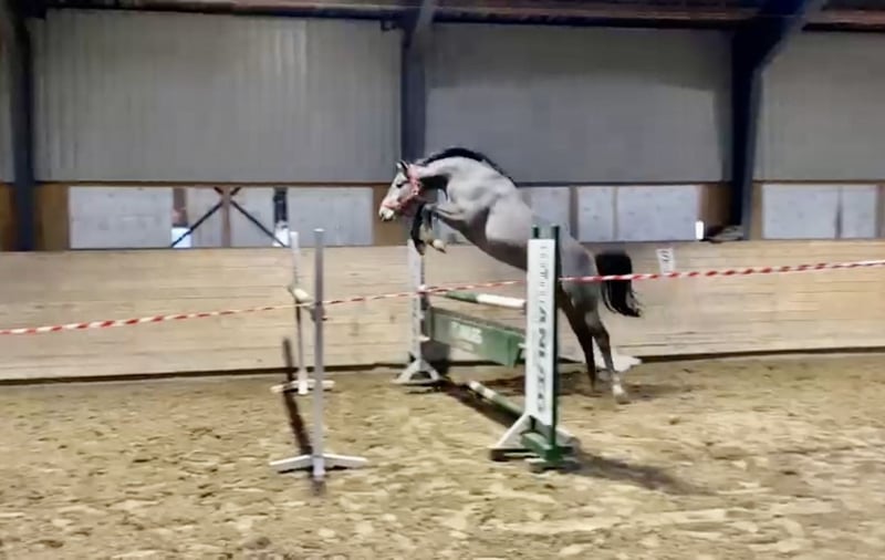 Potencial de semental por Continental Blue. Marcha potente. La yegua madre es hija de Chacco-Lido y ha dado a luz a un semental que participó en la selección de sementales en Herning en 2024. A los 4 años, clasificó para el campeonato de caballos jóvenes y quedó en 6º lugar. Todos sus descendientes tienen un salto muy potente, además de ser cuidadosos y valientes. De la misma yegua madre, tengo este semental de 1 año, un potro por Diablue, y una potranca de 3 años por Diaron. La foto y el video del caballo gris corresponden a su hermano (semental, que participó en Herning). El video con los potros: él es el de color marrón.