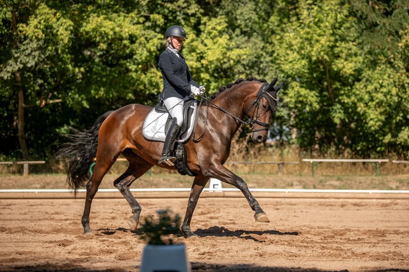 A stunning 10-year-old mare by Tannenhof’s Fahrenheit out of Wolkentanz I is available for sale. She confidently masters all elementary dressage movements up to L** level and has achieved successful results in competitions at both L on bit and double bridle, with scores up to 8.2. From a young age, she has been regularly presented at dressage horse classes A and L, progressing to L** level, and has consistently placed in all classes. She impresses with an outstanding trot characterized by rhythm and elasticity, as well as a good walk and canter, all combined with a high degree of expression. Additionally, she is soft in the hand and easy to ride in contact. This mare is a reliable, well-mannered horse, which makes her easy to ride, though she does require some experience. She needs a rider who can provide her with calmness and confidence in stressful situations, so she is not suitable for beginners or riders without trainer support. She is in excellent health, fully fit, and has no health issues. We will only hand over the mare to the best possible new owner who can provide her with the appropriate environment, including sufficient movement and daily turnout. You can reach me all day via WhatsApp or by phone after 4 p.m. at 0178 3341458.