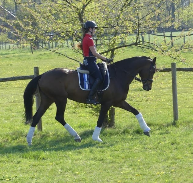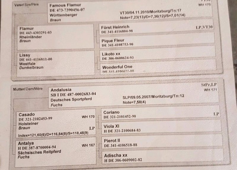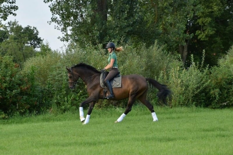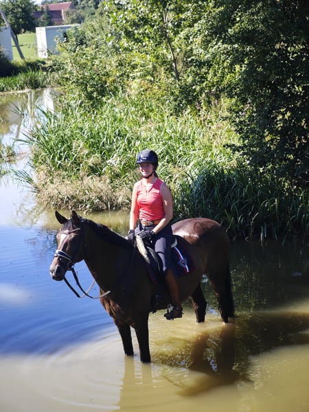 With a heavy heart, I have decided to sell my 2011-born DSP mare, Amie, due to my pregnancy. She is a dark bay with four white socks and stands 17.3 hands high. I have owned her since 2017, and apart from a ring band surgery in 2021, she has been healthy. She has three very good basic gaits. Amie is placed in A dressage and is capable of all L-level movements. She is well-versed in dressage work but can sometimes be a bit mareish in handling and training. She is always well-behaved in the field! However, she is not suitable for beginners. In 2022, she foaled a wonderful mare foal. She was the winner mare at her mare performance test, receiving 8s in walk, trot, and canter. Due to my pregnancy, she has not been in full training recently. This is not a desperate sale; I am only rehoming her to a suitable new owner with a heavy heart. The horse is located in 71299.