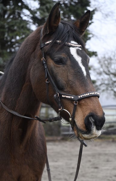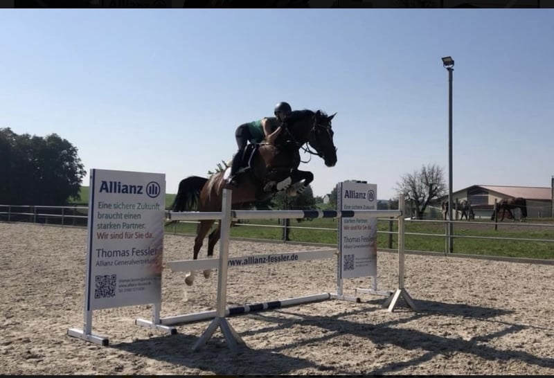 **Diofeh** Unter dem Sattel zeigt sie ein angenehmes Go und gute Gangarten. Aktuell wird sie von meinen Töchtern (14 und 16 Jahre) geritten. Sie ist auch schon mit ihnen problemlos bis 1,25 m gesprungen, was ihre Rittigkeit und Zuverlässigkeit zeigt. Perfektes Pferd um in den Turnier Sport zu starten und sich hochzuarbeiten! Sie ist verladefromm, brav beim Hufschmied und sowohl alleine als auch in der Gruppe geländesicher. Auch Wasser und die Arbeit an der Doppellonge kennt sie. Dio versteht sich mit Wallachen und Stuten gleichermaßen! Sie war letztes Jahr einmal ungeklärt lahm- darf aber seit Monaten normal geritten und auch gesprungen werden!