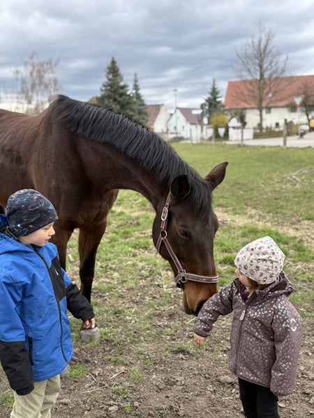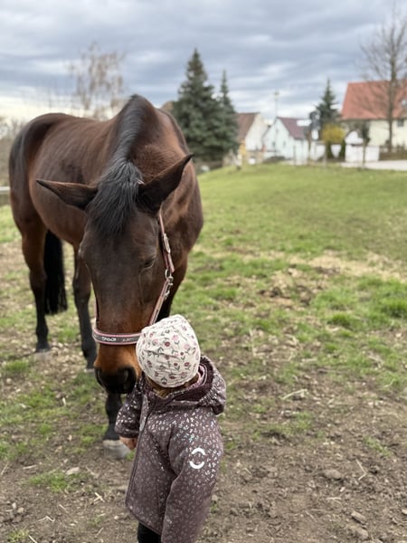 Schweren Herzens habe ich mich dazu entschieden, meine Stute „Lotti“ zu verkaufen. Diese Entscheidung ist mir alles andere als leicht gefallen und ich habe lange mit mir gerungen. Aufgrund meiner zwei kleinen Kinder fehlt mir jedoch die Zeit, ihr die Auslastung zu bieten, die sie braucht. Da zudem meine Tochter Interesse am Reiten zeigt, benötigen wir als Familie ein Pferd, das von allen geritten werden kann. Lotti ist im täglichen Umgang sehr lieb, brav und zuverlässig – selbst meine Kinder können sie problemlos alleine führen und putzen. Auch beim Hufschmied, Tierarzt sowie beim Verladen und Fahren im Pferdeanhänger zeigt sie sich ruhig und unkompliziert. Unarten wie Beißen oder Ähnliches kennt sie nicht. In der Bodenarbeit ist sie ebenfalls sehr angenehm, da sie sich stark am Menschen orientiert und gut mitarbeitet. Beim Reiten benötigt sie jedoch einen erfahrenen Reiter. Sie neigt dazu, sich auf das Gebiss zu legen, ist schreckhaft und kann auch mal zur Seite ausweichen. Ausritte in der Gruppe sind problemlos möglich, alleine ist sie jedoch unsicher und zeigt sich schreckhaft gegenüber „gruseligen“ Dingen. Auch für die Zucht ist sie interessant – sie hat bereits in jungen Jahren ein Fohlen bekommen. Im Becken ist sie etwas schief, was sie beim Reiten jedoch nicht beeinträchtigt. Ich habe daher regelmäßig (halbjährlich) eine osteopathische Behandlung durchführen lassen, was ich auch weiterhin empfehlen würde. Aktuell steht sie in einem Stall mit täglichem Weidegang und nachts in der Box. Ich kann sie mir aber auch gut in einem Offenstall vorstellen. Sie ist regelmäßig entwurmt, vollständig geimpft und wird inklusive komplettem Sattelzeug abgegeben. Mir ist besonders wichtig, dass sie in liebevolle und verantwortungsbewusste Hände kommt. Ein Verkauf an einen Händler kommt für mich nicht in Frage. Ich habe keinen Zeitdruck und wünsche mir für sie ein Zuhause, in dem sie geschätzt und gefördert wird. Platz vor Preis! Bei ernsthaftem Interesse oder für weitere Informationen stehe ich gerne zur Verfügung. Eine Besichtigung und Proberitte sind nach Absprache möglich.
