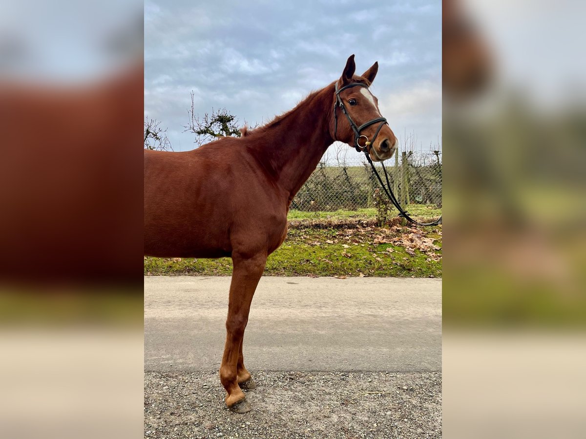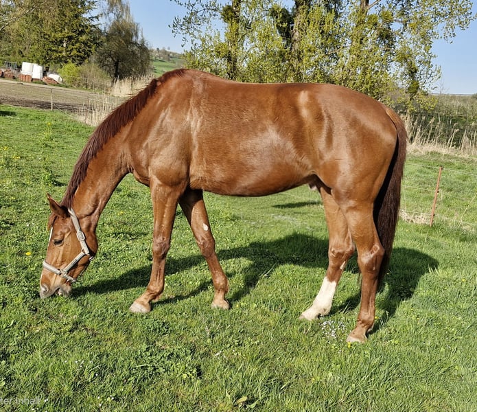 Large-framed German riding horse – Elegant chestnut mare, born 2022 For sale is a beautiful 3½-year-old German sport horse mare. With her striking chestnut coat and an impressive height of 17.7 hands, she is a true eye-catcher both visually and in terms of temperament. She demonstrates talent over fences and has three very good basic gaits. The mare is character-wise impeccable and possesses a pleasant, balanced demeanor, making her suitable for both ambitious leisure riders and competitive riders. She is also very interesting for breeding purposes. As a foal, she was awarded premium status and was reserve champion in the show jumping ring. X-ray images available! Due to a minor issue on the X-ray, she is offered at a significantly reduced price. Please feel free to contact me for further information or if you are interested.