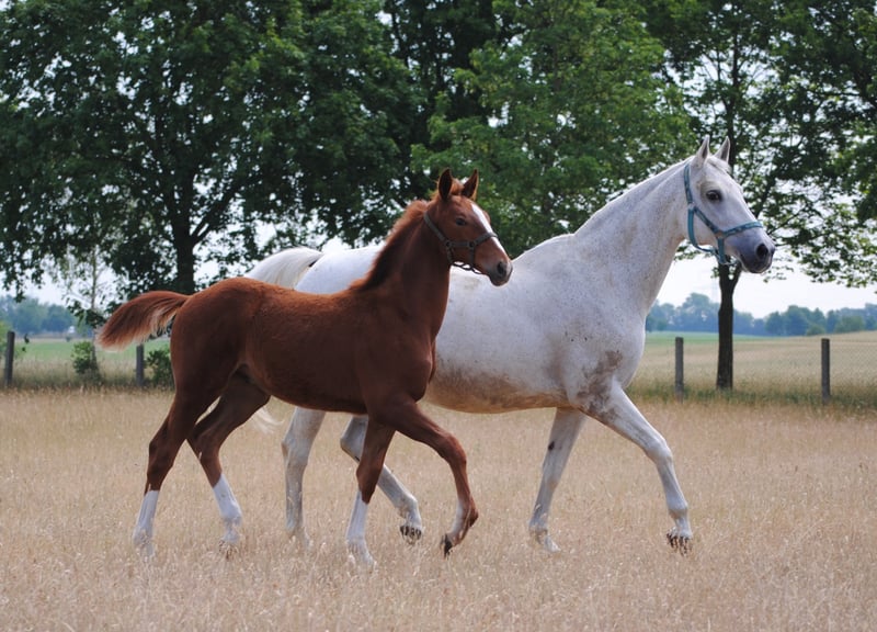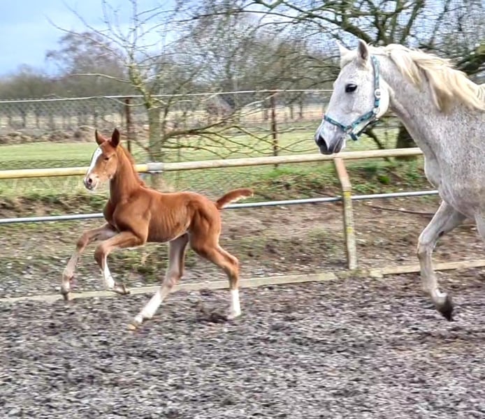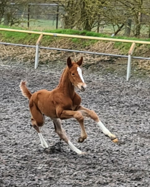 Jako zwiastun wiosny kolorowy lis otworzył tegoroczny sezon źrebiąt. "Mon Ami" Le Chevalier i Marjellchen v. Marduc zaskoczyły wszystkich. Co za mocny fundament, co za doskonałe mocowanie szyi, a następnie ogromny rozmiar. Z energią życiową w kilka minut po urodzeniu na nogach i na wymieniu, więc pierwsze wrażenia. Po dwóch dniach najmłodszy syn 20-letniej córki Marduc poszedł o jeden lepiej na swoim pierwszym spacerze, w którym pokazał ruchy najwyższej jakości. Galop pod górę, który zasługuje na to oznaczenie i akcentowane kolana momenty kłusowania, które sprawiają, że wiele można się spodziewać. Oczywiście koneserzy od razu rejestrują pożądany chów wsobny na naszym byłym głównym reproduktorze Marduc, co przyniosło tu widoczny sukces. Marjellchen, która otrzymała nagrodę stowarzyszenia na ZfdP jako federalna klacz wystawowa w Altefeld, będzie prawdopodobnie jedną z ostatnich aktywnych córek hodowlanych Marduca. Jej syn "Mon Ami" jest obecnie zarejestrowany jako niemiecki szlachetny koń krwi w ZSAA. Z niecierpliwością czekamy na ocenę. Niezwykłe jest jego wielkie podobieństwo do ojcowskiego przyrodniego brata Lamiro, którego niestety musimy wychowywać bez matki.