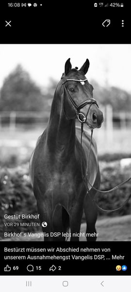 Verkaufe deutsches Sportpferd – Hengst, geb. 2025 Zum Verkauf steht ein beeindruckender deutsches Sportpferd-Hengst, der im Jahr 2025 geboren wurde. Dieses elegante Buckskin-Pferd besticht durch sein auffälliges Erscheinungsbild und seine vielversprechende Abstammung. Leider ist der Vater des Jährlings, die grosse Nachwuchshoffnung , Birkhofs Vangelis, am 1. Februar auf tragische Weise viel zu früh gestorben. Ein Grund mehr, sich noch vorhabdenen Nachwuchs dieses tollen Vererbers zu sichern.Mit einem Stockmaß von 175 cm bietet er die ideale Größe für den grossen Dressursport. Der Hengst ist bestens geeignet für ambitionierte Reiter, die Wert auf Qualität und Leistungsbereitschaft legen. Sein ausgeglichenes Wesen machen ihn zu einem idealen Partner für den Dressursport auf hohem Niveau. Vitus ist freundlich, sehr ausgeglichen und beherrscht das Fohlen ABC. Auf dem 3.Bild ist die Mutter, sie besitzt ein doppelt aufgehelltes Gen, was ihre Fohlen sehr interessant macht. Mutterstamm Leistungsstamm, Vater Vangelis S Dressur siegreich für den Birkhof unterwegs. Bei Interesse oder weiteren Fragen stehe ich Ihnen gerne zur Verfügung. Besichtigung nach Vereinbarung möglich.