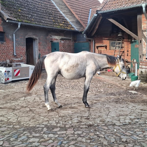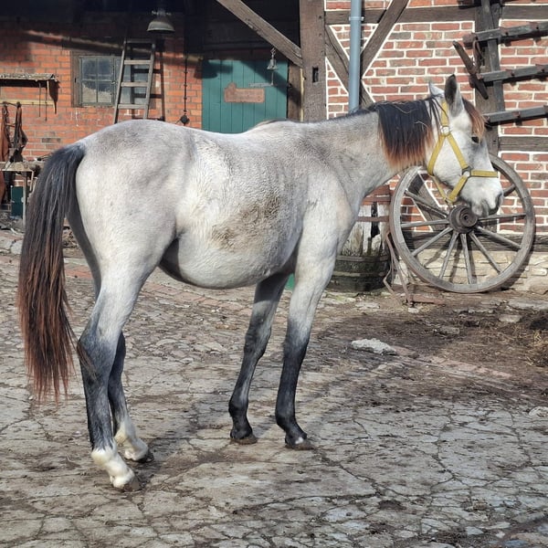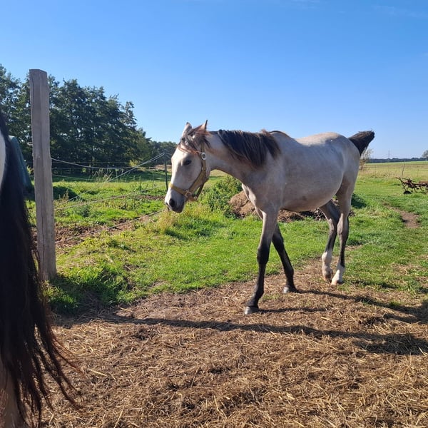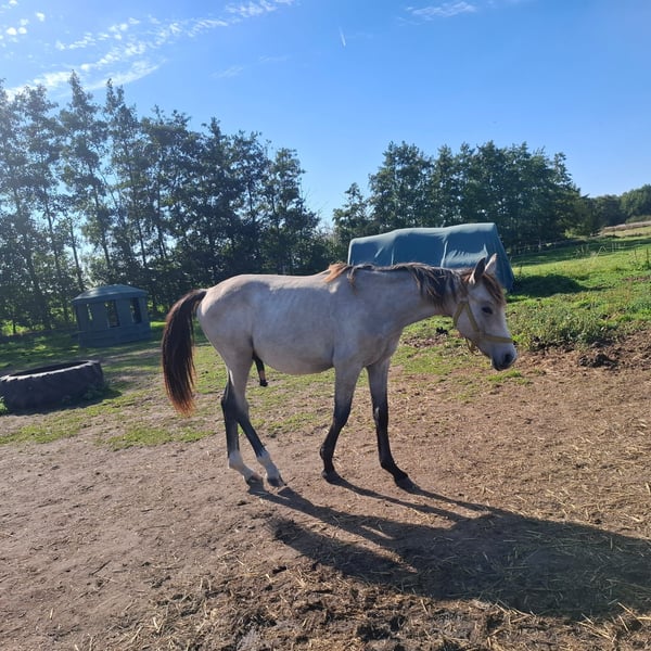 I am selling my nearly 2-year-old grey stallion, "Tayo," with an approximate height of 17.5 hands. He is an absolute dream stallion with wonderful qualities: • Very gentle and affectionate in handling • Familiar with dogs and other animals • Child-friendly and not spooky • Well-socialized • Knows the foal basics (Foal ABC) • Used to pasture turnout He has a lovely temperament and is very easy to handle. The stallion is healthy and lively. Additionally, he is completely gelding-safe. Please feel free to contact me with any questions.