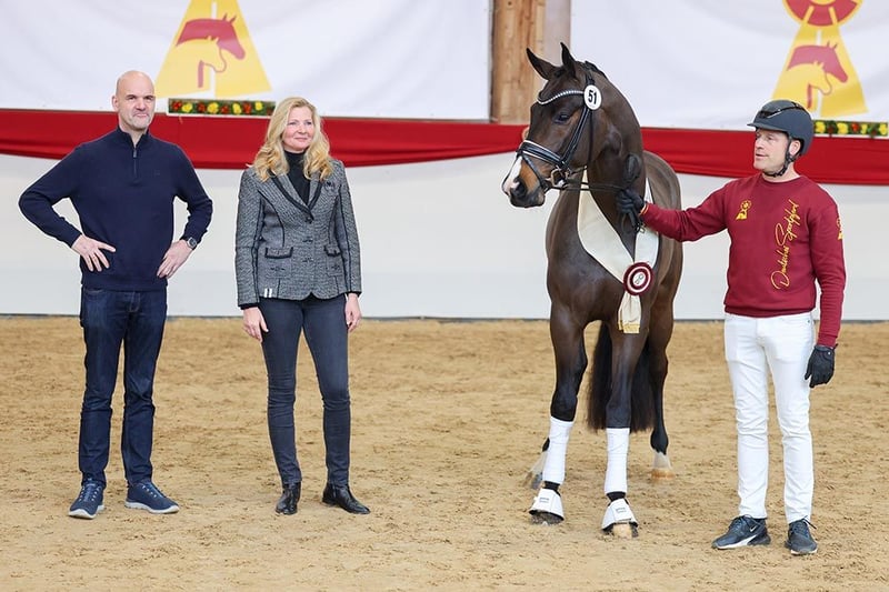 Donkey Amour begeisterte sowohl die Körkommission als auch das fachkundige Publikum bei den DSP-Hengsttagen in München-Riem 2025. Er wurde als strahlender Prämienhengst herausgestellt. Dressur-Körkommissar Jörg Schröter beschreibt ihn treffend: „Wir sehen hier ein ganz besonders sympathisches und vor allen Dingen auch unheimlich schönes Pferd, ein Pferd was durch seine Grundgangarten beeindruckt, aber vor allem auch durch sein sehr gutes Interieur, sein waches Auge und seine Gelassenheit. Eine besondere Aura gepaart mit diesem kraftvollen und vom Boden weg federnden Trabablauf hat ausgesprochen gut gefallen. Hervorzuheben ist die gute Schrittarbeit, besonders raumgreifend, ganz klar im Takt, mit gutem Vor- und Übertritt ausgestattet. Hier sehen wir ein wirklich gleichmäßig gutes Pferd mit einer besonderen Ausstrahlung.“ Gerd Sosath freut sich über den Neuerwerb: "Als ich auf der Körung in München war, hat mich dieser Hengst vom ersten Tag an begeistert. Da wir den Vater Donkey Boy vermarkten, hatte ich immer ein besonderes Auge auf ihn und wurde nicht enttäuscht. Ich konnte ihn live beobachten und wurde von seinen drei herausragenden Grundgangarten und seinem sympathischen Auftreten überzeugt. Sein noch jugendlicher Typ bietet viel Potential für die Zukunft. Die Ersteigerung des Prämienhengstes auf der anschließenden Auktion war das Highlight des Wochenendes im Süden. Er wird sicher hervorragend zu den Stuten unseren Züchter passen." Abstammung Vater Donkey Boy wurde 2023 zum "Hengst des Jahres" beim Dänischen Warmblutpferdezuchtverband gekürt und siegte 2022 in Intermediaire II und Grand Prix unter Anne-Mette Strandby Hansen in Skårup Fyn. Bei den Weltmeisterschaften für junge Pferde platzierte er sich drei Jahre in Folge und gewann 2016 unter seinem Reiter Jan Møller Christensen die Bronzemedaille sowie 2017 die Silbermedaille. Zudem schrieben Christensen und Donkey Boy Geschichte, indem sie vier Jahre in Folge (2016-2019) die Dänischen Meisterschaften der jungen Pferde gewannen. Auf seiner Körung 2015 war Donkey Boy Prämienhengst und siegte in seiner Hengstleistungsprüfung im darauffolgenden Herbst. Donkey Amour's Mutter Sonnenschein S war selbst bis S-Dressur erfolgreich und in M**-Dressuren siegreich. In Verbindung mit Floriscount brachte sie Flashlight S, die bereits in Dressurpferdeprüfungen siegreich ist. Muttervater San Amour war Hauptprämiensieger und ist ausgebildet bis zur schweren Klasse. Er brachte bisher knapp 50 gekörte Söhne. Über 40 seiner Nachkommen sind in Grand Prix angekommen, darunter Honoré du Soir's Schwester Soiree d'Amour OLD. Der dritte Vater Cabaret hat sich als Vielseitiger Vererber herausgestellt, Campari ging beispielsweise Dressur bis Intermediaire I, Catalina war erfolgreich in CCI3*-Vielseitigkeiten und Casta Diva in 1,45m-Springen. Anschluss zum Springblut gibt es über die vierte Mutter Debuet (1,30m), sowie den vierten Vater Campari M, der in S-Springen erfolgreich war.