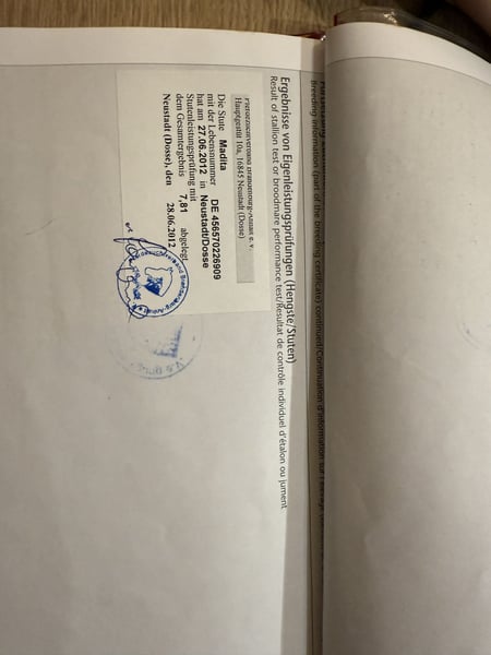 Vendemos nuestra yegua de 16 años, de sangre Chacco-Blue / Levisto, para reproducción. Ha pasado la prueba de rendimiento para yeguas y está inscrita en el studbook. Ella misma ha competido hasta la categoría M* con éxito y ha obtenido varias colocaciones. En su manejo, es completamente fácil, nunca se asusta y también es muy manejable para niños. Por supuesto, es tranquila en la forja y en el transporte. Es muy amable tanto con otros caballos, animales y personas, y tiene una actitud muy abierta. Solo se entrega a manos responsables y de confianza.