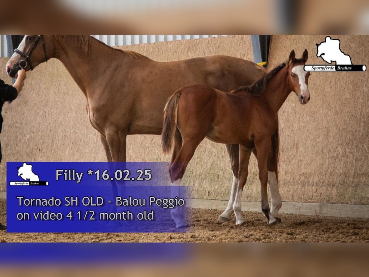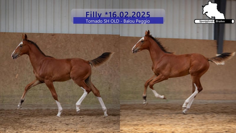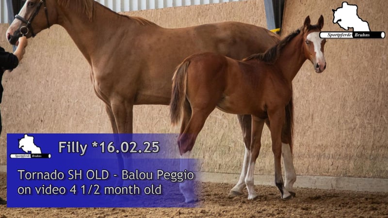Diese junge Dame überzeugt durch ihren wirklich guten Rahmen, ihre Übersetzung sowie ihre individuelle Zeichnung. Ihr Vater Tornado SH (Toulon x Diamant de Semilly) ist bereits 6jährig hocherfolgreich in der internationalen Youngstertour und Seriensieger in Springpferdeprüfungen bis zur Klasse M. Enormes Vermögen und eine Übersetzung für die großen Plätze unserer Zeit sind hier nur beispielhaft als Vorzüge zu nennen. Auch der Mutterstamm ist hier sehr interessant. Die Mutter vom Balou Peggio entstammt aus der Vollschwester zu unserem Hengst Gepsom. Gepsom war u.a. hocherfolgreich platziert in schweren Springen bis 1,55 auf dem Hamburger Derby oder auf der Deutschen Meisterschaft in Balve. Dieses Stutfohlen vereint den Kampfgeist und die enorme Sportlichkeit der Mutterlinie mit dem fulminaten Vermögen, der üppigen Übersetzung und der rahmigen Größe der Vaterseite zu einem Win-Win Gesamtpaket.