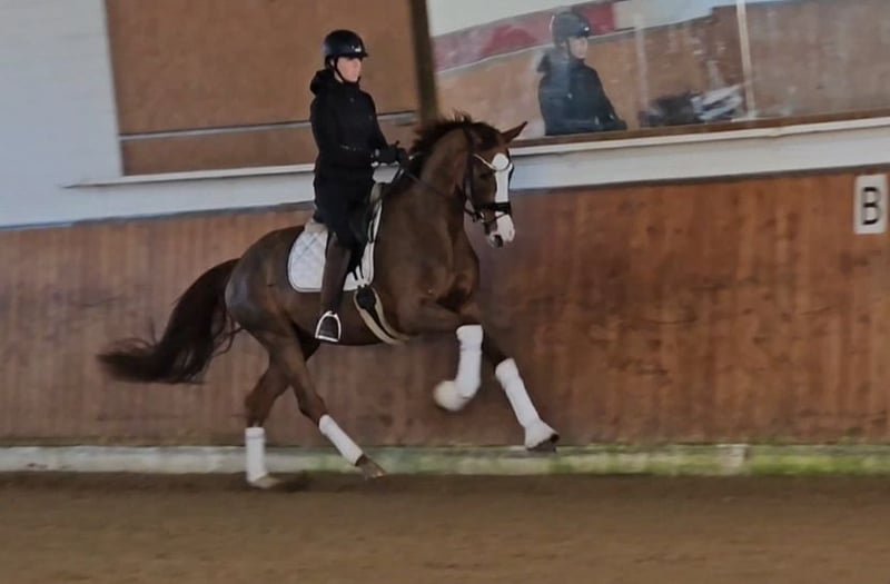 **Wir berechnen für das Probereiten eine Gebühr von 50€. Bei Kauf wird diese selbstverständlich angerechnet.** Zum Verkauf steht eine elegante und talentierte Dunkelfuchsstute, geboren im Jahr 2022. Neben ihren drei sehr guten Grundgangarten verfügt sie über eine beeindruckende Erscheinung, die sofort ins Auge fällt. Mit einem Stockmaß von 169 cm bietet sie die perfekte Größe für ambitionierte Reiterinnen und Reiter. Ihre Stärken liegen im Dressursport: sie zeigt viel Talent, Elastizität und eine angenehme Grundhaltung. Die Stute ist gerade angeritten, fein an den Reiter zu gewöhnen, und besitzt ein vielversprechendes Potenzial für den Turniersport oder den gehobenen Freizeitreitsport. Was sicherlich noch zu erwähnen ist, ist die absolute Unerschrockenheit dieses Pferdes. Sie ist gesund, regelmäßig geimpft und entwurmt, sowie gut im Umgang. Die Stute ist bereit für ihre nächsten Aufgaben und freut sich auf eine/n engagierte/n Reiter/in, der/die ihre Fähigkeiten weiter fördert. Sowohl für den Profi, als auch für den Amateur geeignet. Ein guter TÜV mit Hals und Rücken liegt vor. Bei Interesse, oder für weitere Informationen stehe ich gerne und ausschließlich unter 01738219886 zur Verfügung.