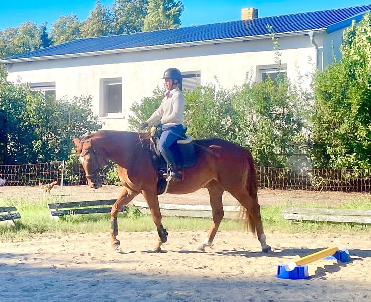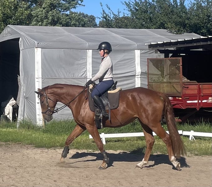 Se ofrece a la venta, de nuestra propia cría, una yegua joven con gran movimiento y excelentes genes para la doma. La yegua alazán de tres años impresiona por su excelente carácter y presencia. Con una clara perspectiva en la disciplina de doma, proviene de una línea materna orientada al rendimiento (Belantis – Quaterback) y hereda la genética del probado Dante’s Stern por parte de padre. Está inscrita en el libro genealógico del PZVBA y ha superado con éxito su prueba de rendimiento para yeguas, lo que la hace muy interesante para la cría. La yegua se muestra amigable, atenta y sin miedo en su manejo diario. Sus movimientos básicos destacan por su elasticidad y impulso natural. Está montada y trabaja con mucha disposición y claridad. Actualmente mide aproximadamente 1,70 m. También en el campo muestra interés y afronta cada situación con gran seguridad. ⸻ Adecuación: - Doma (caballo joven con potencial) - Cría (ya evaluada y inscrita) - Entusiasta de la equitación de ocio ¡No para comerciantes! Para más información, no dudes en visitar: www.ufanohof.de y 0179/7542321