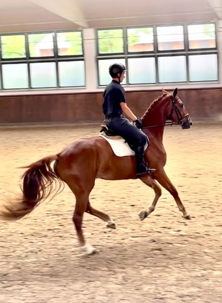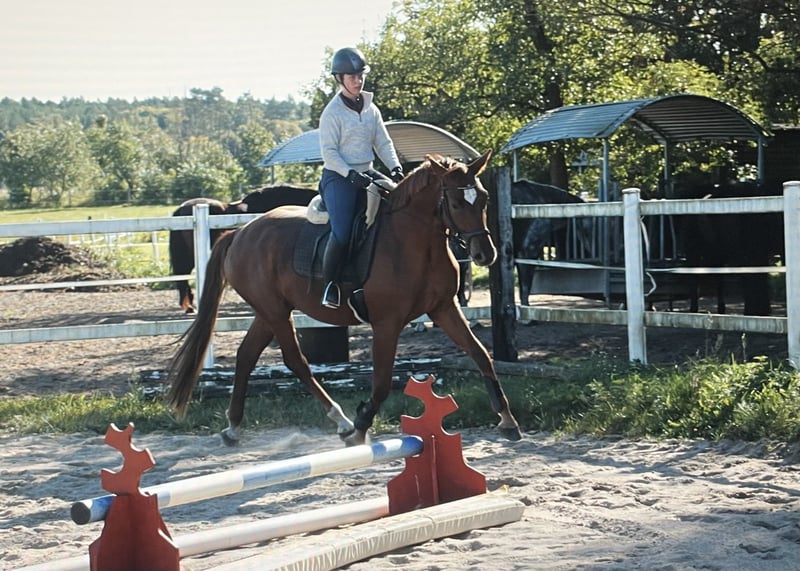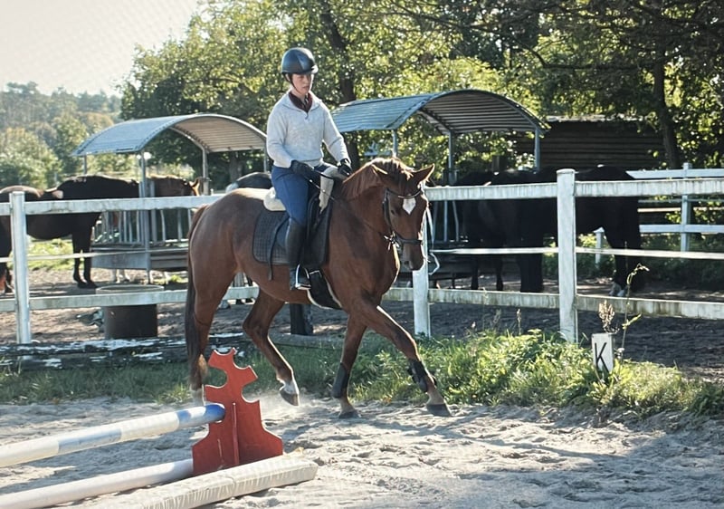 Te koop staat uit eigen fokkerij een energieke jonge merrie met uitstekende dressuurgenen. De driejarige vosmerrie overtuigt met haar uitstekende karakter en veel uitstraling. Ze heeft een duidelijke dressuuroptie en komt uit een prestatiegerichte moederlijn (Belantis – Quaterback), en voert de genetica van de bewezen Dante Stern van vaderszijde. Ze is ingeschreven in het stamboek van de PZVBA en heeft haar merrietest succesvol afgerond – hierdoor is ze ook zeer interessant voor de fokkerij. De merrie toont zich in de dagelijkse omgang vriendelijk, alert en onbevreesd. Haar basisgangen overtuigen door elasticiteit en natuurlijke schwung. Ze wordt bereden en werkt met veel leergierigheid en overzicht. Haar huidige schofthoogte is 1,70 m. Ook in het terrein toont ze interesse en weet elke situatie zeer souverain te beheersen. ⸻ Geschiktheid: - Dressuursport (jong paard met perspectief) - Fokkerij (al prestatiegericht en ingeschreven) - Ambitieuze vrijetijdssport Niet voor handelaren! Bij interesse graag meer informatie op www.ufanohof.de en 0179/7542321