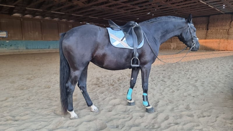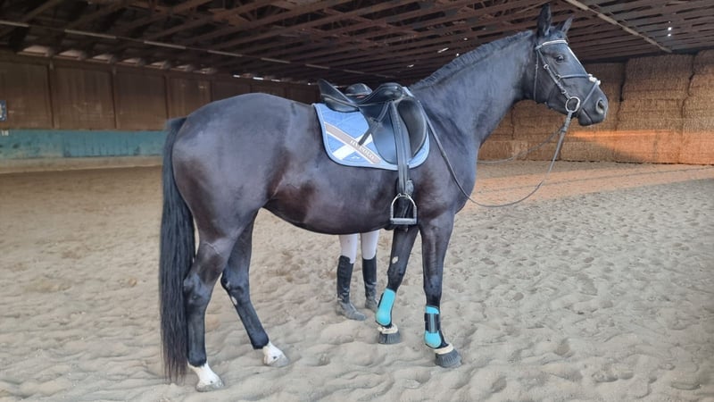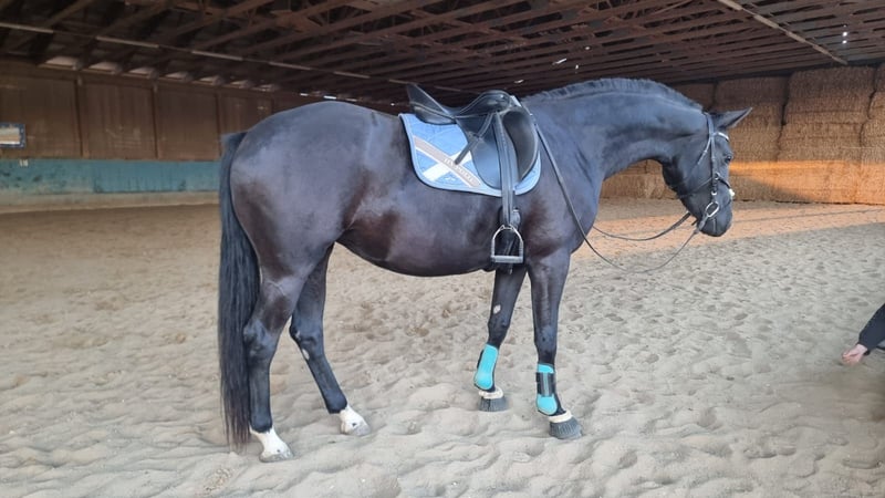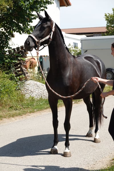 Turn The Tide AM is a stunning, large-framed black mare of modern sport horse type with excellent conformation. Born in May 2022, she currently measures approximately 16.1 hh. Tess impresses not only with her elegant appearance and expressive coloring but also with a particularly correct foundation and healthy prerequisites for a sporting career. Raised under optimal conditions from a young age, she is exceptionally friendly, human-oriented, and open in daily handling. She is curious, affectionate, and easy to manage — whether at the vet or the farrier. Turn The Tide AM is front-shod, regularly vaccinated and dewormed, and has experience with box stall and paddock turnout as well as herd life. She remains balanced and social in all types of housing. In terms of character, Tess possesses all the qualities one would wish for in a young horse: she is well-behaved, eager to learn, and always attentive during work. She is currently being gently backed and is familiar with lunging work as well as her first trail rides in walk, accompanied by an experienced horse. The mare consistently works with motivation and remains well-behaved in the field. Her excellent basic gaits speak for themselves — especially her clear, rhythmical walk, elastic trot with good shoulder freedom, and uphill canter suggest a high dressage potential. Her pedigree further supports this assessment: she comes from a performance-tested line focused on talent, rideability, and sporting aptitude (Topas v. Totilas x Donnerhall). The combination of talent and character makes her a promising young dressage prospect. Turn The Tide AM is available directly from the breeder. She is ideal for ambitious riders seeking a young, high-quality horse with potential for competition.