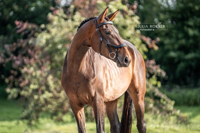 For sale is a well-behaved 4-year-old mare from a dam line with a lot of bloodlines. She has been kept in a species-appropriate manner with plenty of turnout (in winter, daily paddock time of at least 10-12 hours, and in the summer months, 24-hour pasture access) and has been handled daily. The sire, El Salvador, a state stallion at the Moritzburg State Stud, is a competition-successful descendant of Escolar and Sandro Hit. He is paired with a dam line that has Thoroughbred connections. This beautiful and spirited mare would certainly also be suitable for eventing. The mare is currently lunged and is familiar with a rider's weight at the walk.