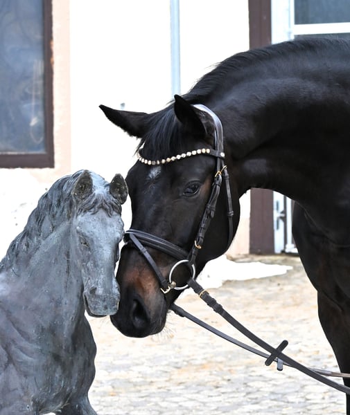 Princess ist eine 6jährige Stute mit einem wirklich bemerkenswerten Charakter. Sie ist nicht nur traumhaft schön, sondern in allen Belangen auch sehr brav. Selbst in ungewohnter Umgebung und bei viel Trubel nicht guckig und immer mutig genug, dass sie ohne Probleme überall dort hinläuft, wo ihr Reiter hin möchte. Sie ist in der Dressur bis zur Kl. L/M ausgebildet, war aber noch nicht auf dem Turnier. Sie beherrscht sicher Schulterherein, Schenkelweichen, Außengalopp, einfachen Galoppwechsel, Kurzkehrt usw. Fliegender Galoppwechsel noch nicht ganz sicher, wird aber immer besser. Im Galopp und Trab sehr schön zu sitzen, dabei mit sehr konstanter und feiner Anlehnung. Hand- und Bodenarbeit kennt sie auch schon. Sie geht allein und in der Gruppe ins Gelände und macht auch einen kleinen Sprung mit schöner Art. Regelmäßig entwurmt und geimpft. Aktuelle AKU mit 21 Röntgenbildern ohne Befund.